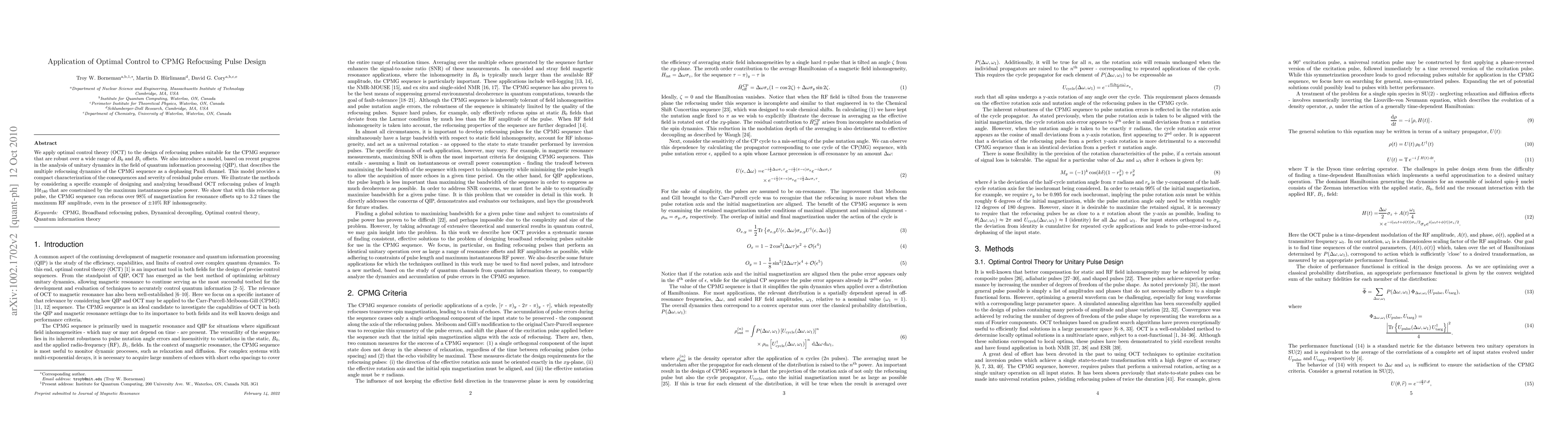 This research applies optimal control theory to design robust refocusing pulses for CPMG sequences, accommodating wide B0 and B1 offset ranges. It introduces a quantum information processing-based model to characterize CPMG dynamics, demonstrating that 98% magnetization refocusing is achievable with 10 t180 pulses under +/- 10% RF inhomogeneity, even for resonance offsets up to 3.2 times the maximum RF amplitude.