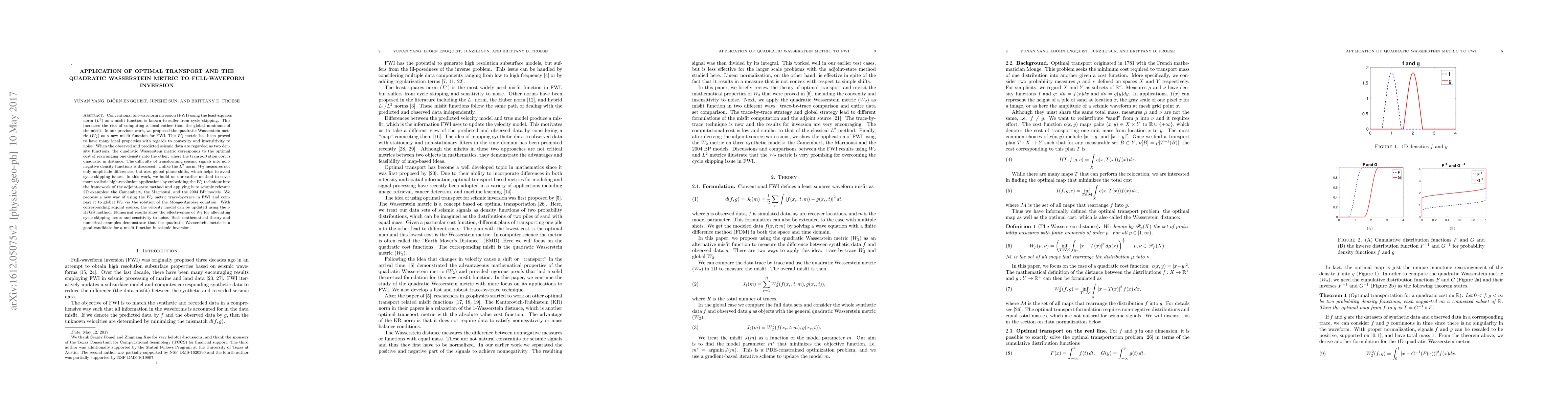This paper proposes using the quadratic Wasserstein metric ($W_2$) to improve full-waveform inversion (FWI) by addressing cycle skipping and noise sensitivity issues, demonstrating its effectiveness through 2D seismic examples and comparing it with the traditional $L^2$ norm.