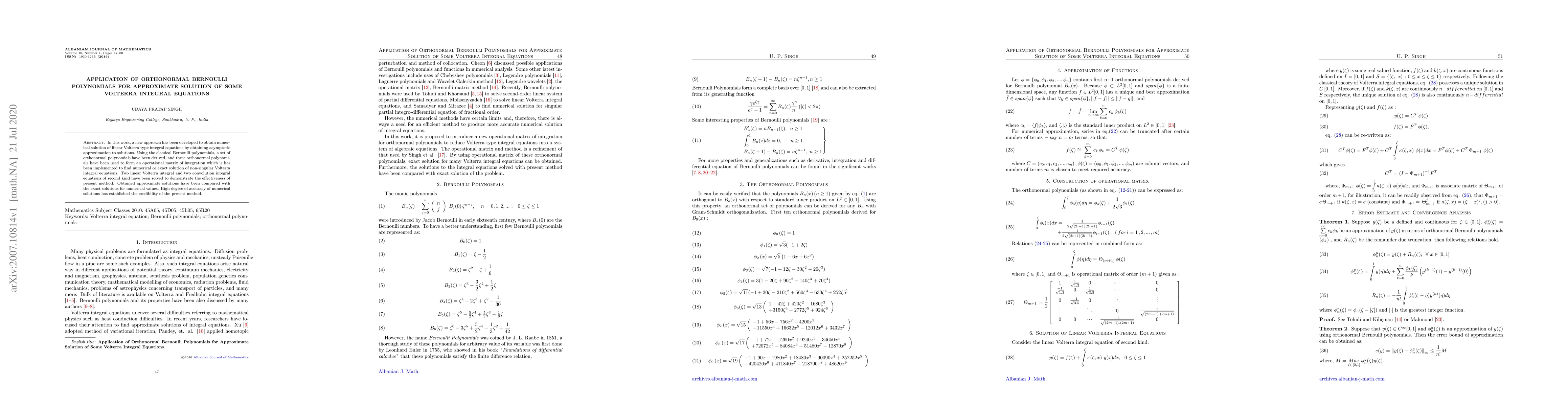 In this work, a new approach has been developed to obtain numerical solution of linear Volterra type integral equations by obtaining asymptotic approximation to solutions. Using the classical Bernoulli polynomials, a set of orthonormal polynomials have been derived, and these orthonormal polynomials have been used to form an operational matrix of integration which is has been implemented to find numerical or exact solution of non-singular Volterra integral equations. Two linear Volterra integral and two convolution integral equations of second kind have been solved to demonstrate the effectiveness of present method. Obtained approximate solutions have been compared with the exact solutions for numerical values. High degree of accuracy of numerical solutions has established the credibility of the present method.