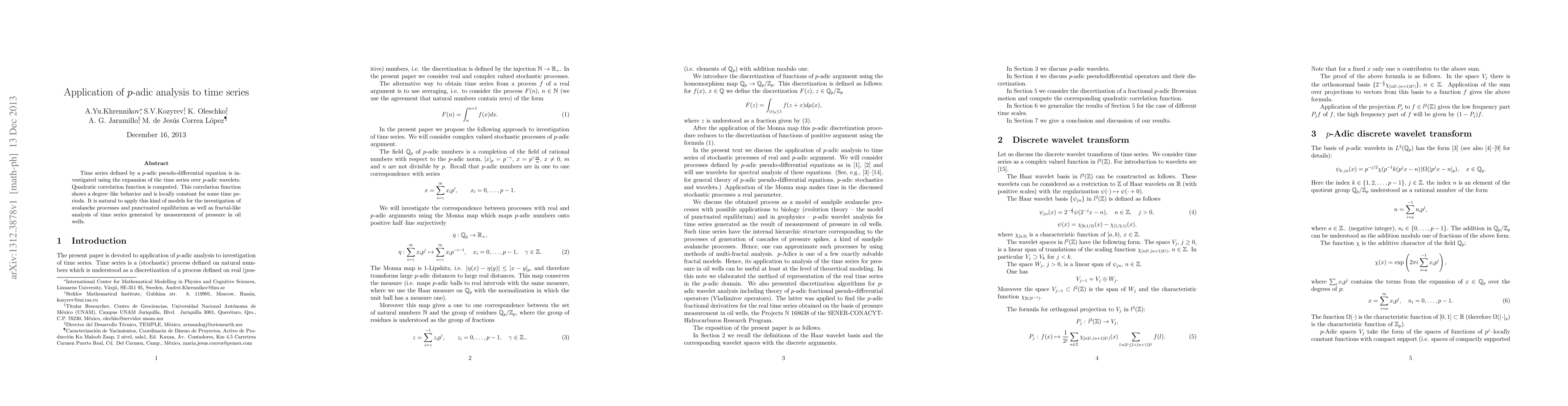Researchers used p-adic analysis to study time series patterns, finding a quadratic correlation function that exhibits degree-like behavior and is locally constant for certain periods. This method has potential applications in analyzing complex phenomena like avalanche processes and fractal-like patterns in pressure measurements from oil wells.