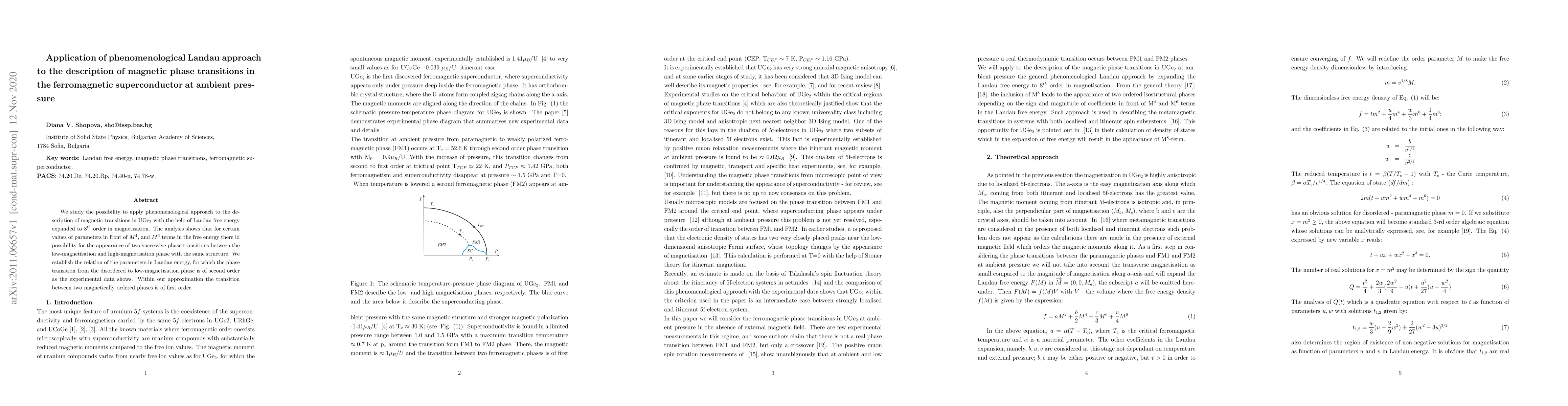We study the possibility to apply phenomenological approach to the description of magnetic transitions in UGe2 with the help of Landau free energy expanded to 8-th order in magnetisation. The analysis shows that for certain values of parameters in front of M^4, and M^6 terms in the free energy there id possibility for the appearance of two successive phase transitions between the low-magnetisation and high-magnetisation phase with the same structure. We establish the relation of the parameters in Landau energy, for which the phase transition from the disordered to low-magnetisation phase is of second order as the experimental data shows. Within our approximation the transition between two magnetically ordered phases is of first order