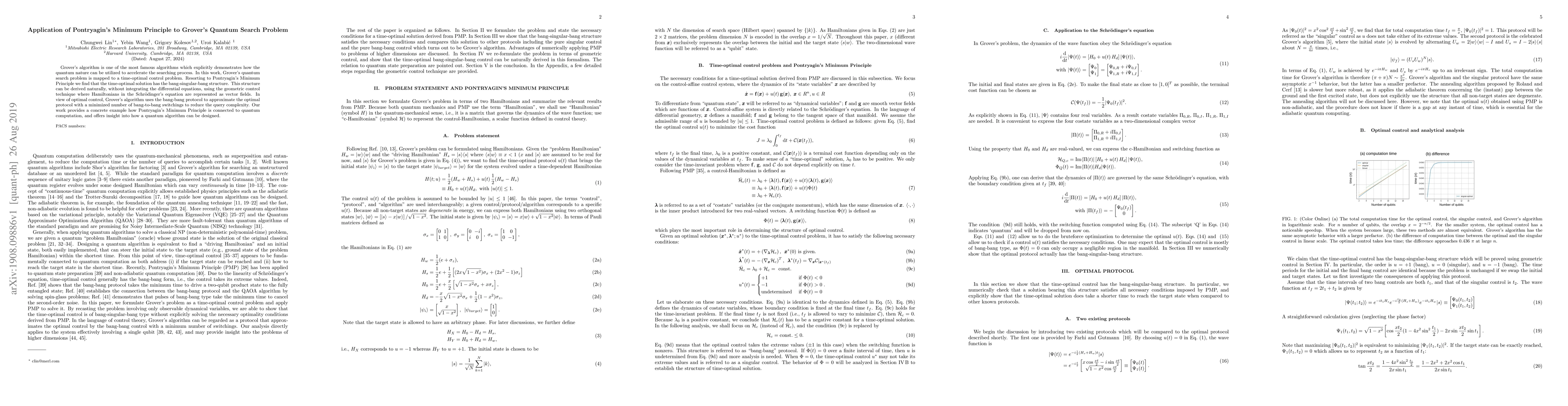 This paper applies Pontryagin's Minimum Principle to Grover's quantum search algorithm, mapping it to a time-optimal control problem. The analysis reveals a bang-singular-bang structure for the time-optimal solution, demonstrating how quantum computation can be optimized using geometric control techniques.