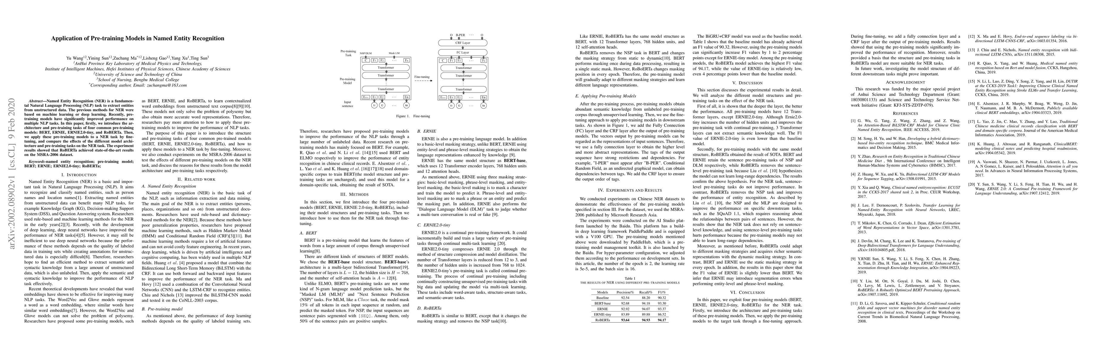 This paper explores the application of four pre-training models—BERT, ERNIE, ERNIE2.0-tiny, and RoBERTa—for Named Entity Recognition (NER) by fine-tuning them. The results indicate that RoBERTa achieved the best performance on the MSRA-2006 dataset, demonstrating the effectiveness of pre-training models in NLP tasks.