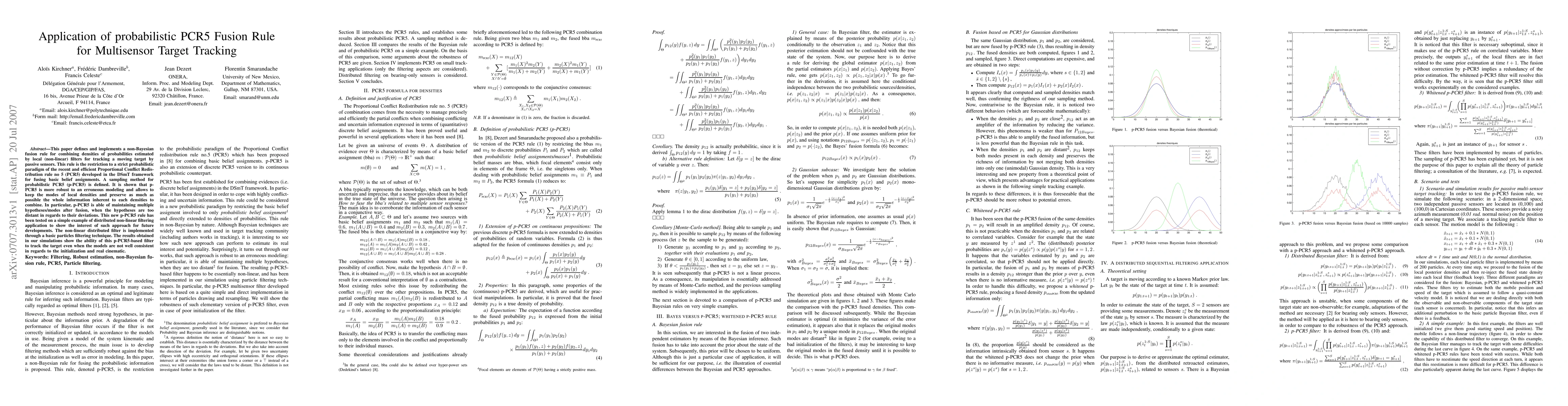 This paper defines and implements a non-Bayesian fusion rule for combining densities of probabilities estimated by local (non-linear) filters for tracking a moving target by passive sensors. This rule is the restriction to a strict probabilistic paradigm of the recent and efficient Proportional Conflict Redistribution rule no 5 (PCR5) developed in the DSmT framework for fusing basic belief assignments. A sampling method for probabilistic PCR5 (p-PCR5) is defined. It is shown that p-PCR5 is more robust to an erroneous modeling and allows to keep the modes of local densities and preserve as much as possible the whole information inherent to each densities to combine. In particular, p-PCR5 is able of maintaining multiple hypotheses/modes after fusion, when the hypotheses are too distant in regards to their deviations. This new p-PCR5 rule has been tested on a simple example of distributed non-linear filtering application to show the interest of such approach for future developments. The non-linear distributed filter is implemented through a basic particles filtering technique. The results obtained in our simulations show the ability of this p-PCR5-based filter to track the target even when the models are not well consistent in regards to the initialization and real cinematic.
