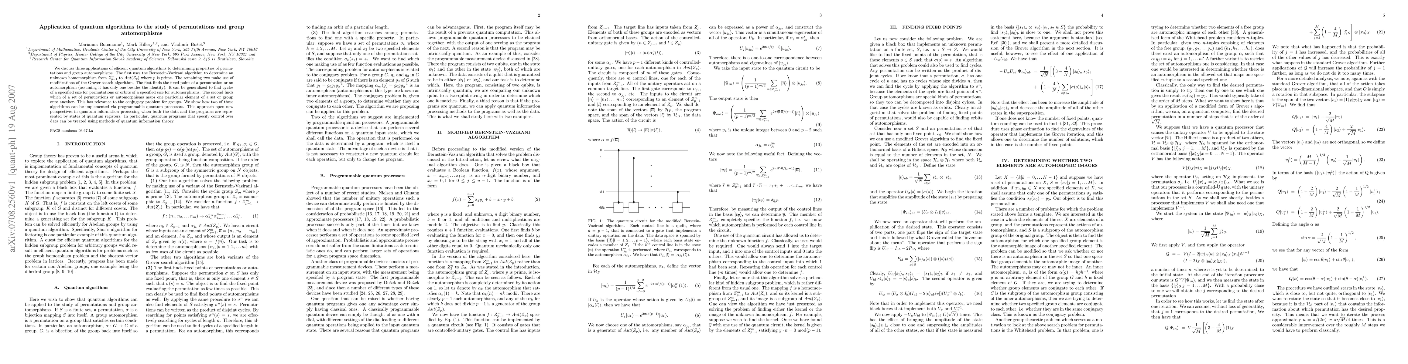We discuss three applications of efficient quantum algorithms to determining properties of permutations and group automorphisms. The first uses the Bernstein-Vazirani algorithm to determine an unknown homomorphism from $Z_{p-1}^{m}$ to $Aut(Z_{p})$ where $p$ is prime. The remaining two make use of modifications of the Grover search algorithm. The first finds the fixed point of a permutation or an automorphism (assuming it has only one besides the identity). It can be generalized to find cycles of a specified size for permutations or orbits of a specified size for automorphisms. The second finds which of a set of permutations or automorphisms maps one particular element of a set or group onto another. This has relevance to the conjugacy problem for groups. We show how two of these algorithms can be implemented via programmable quantum processors. This approach opens new perspectives in quantum information processing, wherein both the data and the programs are represented by states of quantum registers. In particular, quantum programs that specify control over data can be treated using methods of quantum information theory.