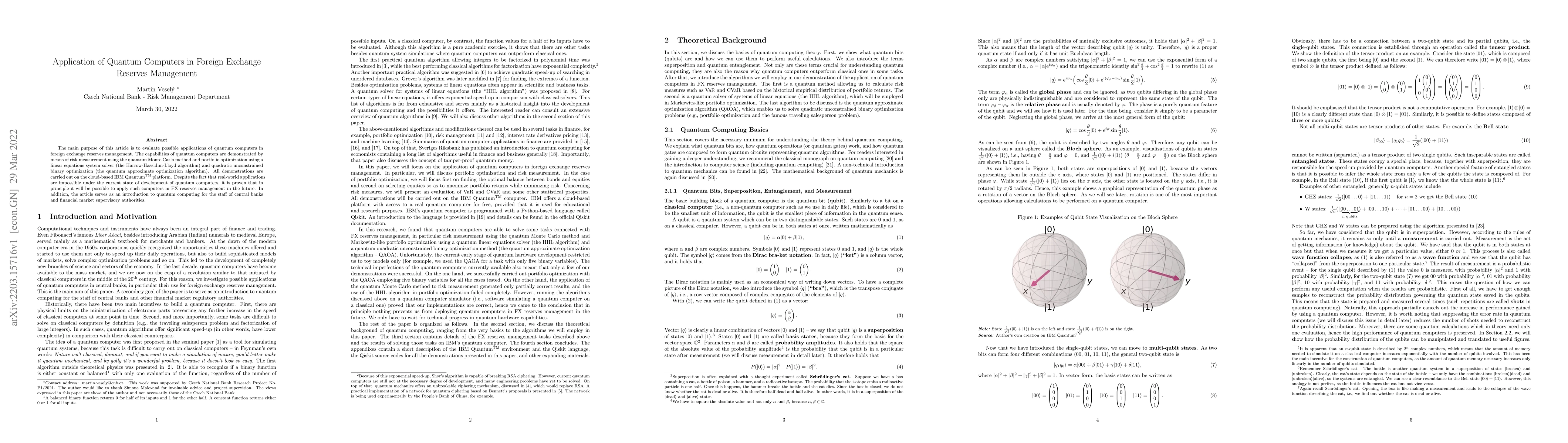 The main purpose of this article is to evaluate possible applications of quantum computers in foreign exchange reserves management. The capabilities of quantum computers are demonstrated by means of risk measurement using the quantum Monte Carlo method and portfolio optimization using a linear equations system solver (the Harrow-Hassidim-Lloyd algorithm) and quadratic unconstrained binary optimization (the quantum approximate optimization algorithm). All demonstrations are carried out on the cloud-based IBM Quantum(TM) platform. Despite the fact that real-world applications are impossible under the current state of development of quantum computers, it is proven that in principle it will be possible to apply such computers in FX reserves management in the future. In addition, the article serves as an introduction to quantum computing for the staff of central banks and financial market supervisory authorities.