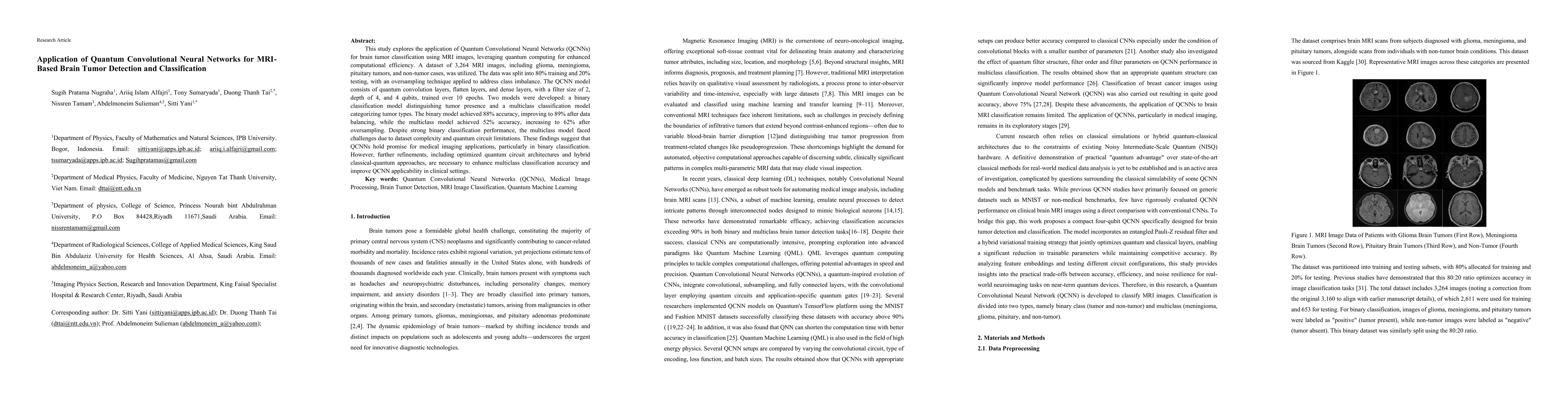 This study explores the application of Quantum Convolutional Neural Networks (QCNNs) for brain tumor classification using MRI images, leveraging quantum computing for enhanced computational efficiency. A dataset of 3,264 MRI images, including glioma, meningioma, pituitary tumors, and non-tumor cases, was utilized. The data was split into 80% training and 20% testing, with an oversampling technique applied to address class imbalance. The QCNN model consists of quantum convolution layers, flatten layers, and dense layers, with a filter size of 2, depth of 4, and 4 qubits, trained over 10 epochs. Two models were developed: a binary classification model distinguishing tumor presence and a multiclass classification model categorizing tumor types. The binary model achieved 88% accuracy, improving to 89% after data balancing, while the multiclass model achieved 52% accuracy, increasing to 62% after oversampling. Despite strong binary classification performance, the multiclass model faced challenges due to dataset complexity and quantum circuit limitations. These findings suggest that QCNNs hold promise for medical imaging applications, particularly in binary classification. However, further refinements, including optimized quantum circuit architectures and hybrid classical-quantum approaches, are necessary to enhance multiclass classification accuracy and improve QCNN applicability in clinical settings.