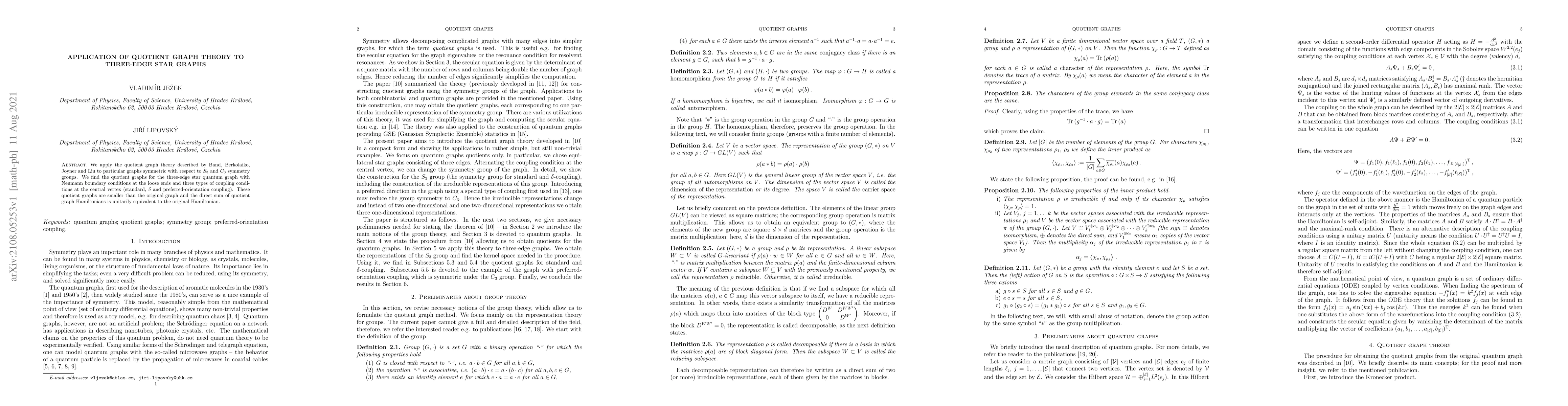 This paper applies quotient graph theory to three-edge star graphs with $S_3$ and $C_3$ symmetry, finding smaller quotient graphs that are unitarily equivalent to the original Hamiltonian under various coupling conditions. The study reveals the equivalence of the direct sum of quotient graph Hamiltonians to the original Hamiltonian.