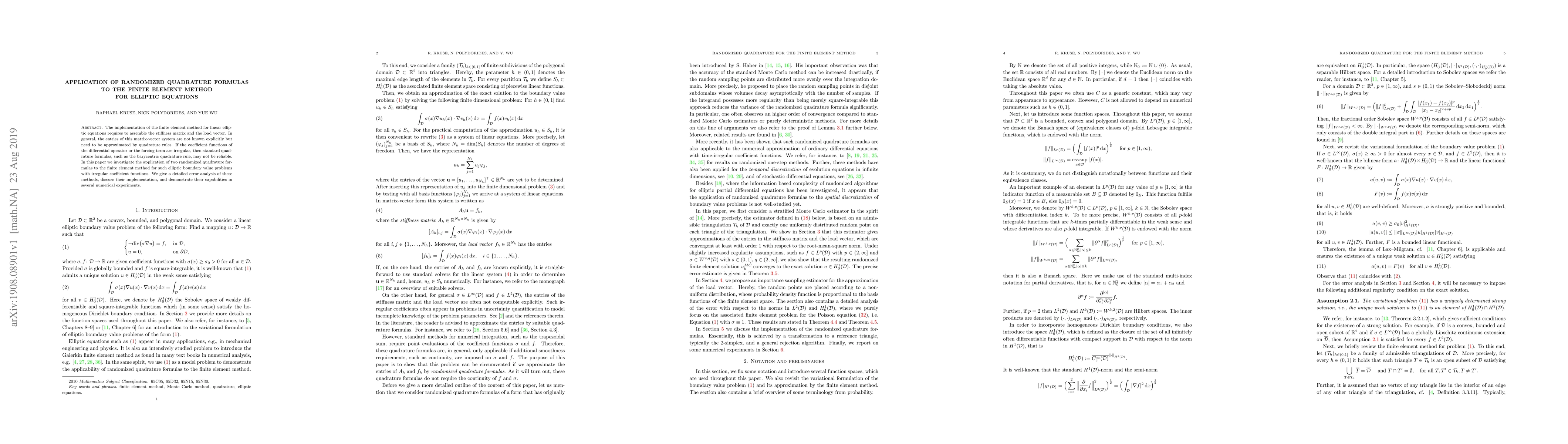 This paper explores the use of randomized quadrature formulas in the finite element method for solving linear elliptic equations with irregular coefficient functions. It provides an error analysis, implementation details, and demonstrates the effectiveness through numerical experiments.
