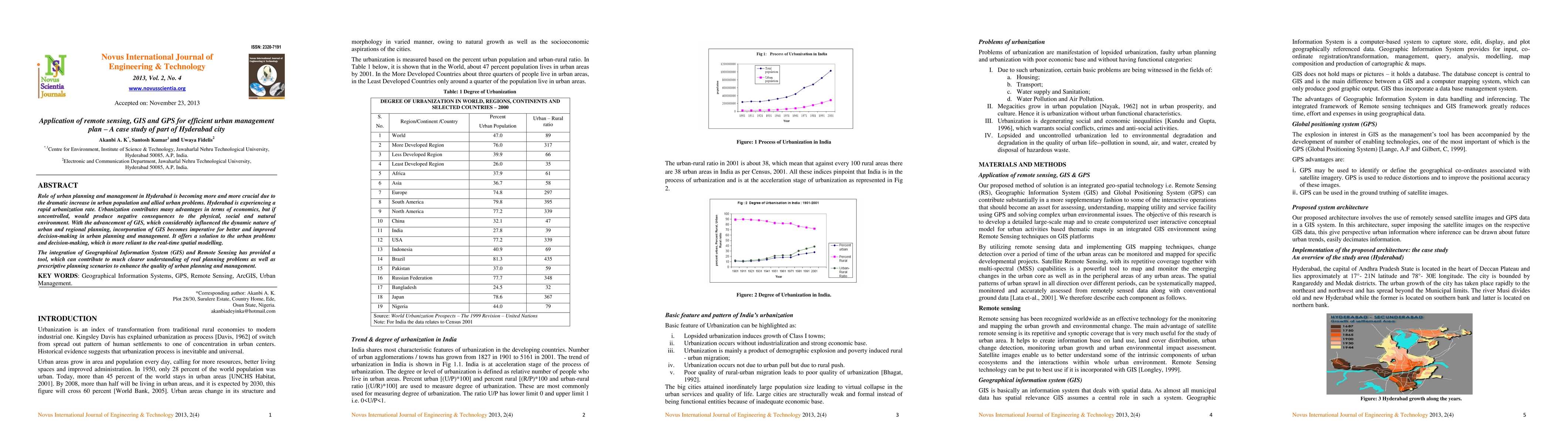 This paper explores the application of GIS, Remote Sensing, and GPS for developing an efficient urban management plan in Hyderabad, India. It emphasizes the importance of these technologies in addressing urban growth challenges and improving decision-making through real-time spatial modeling.