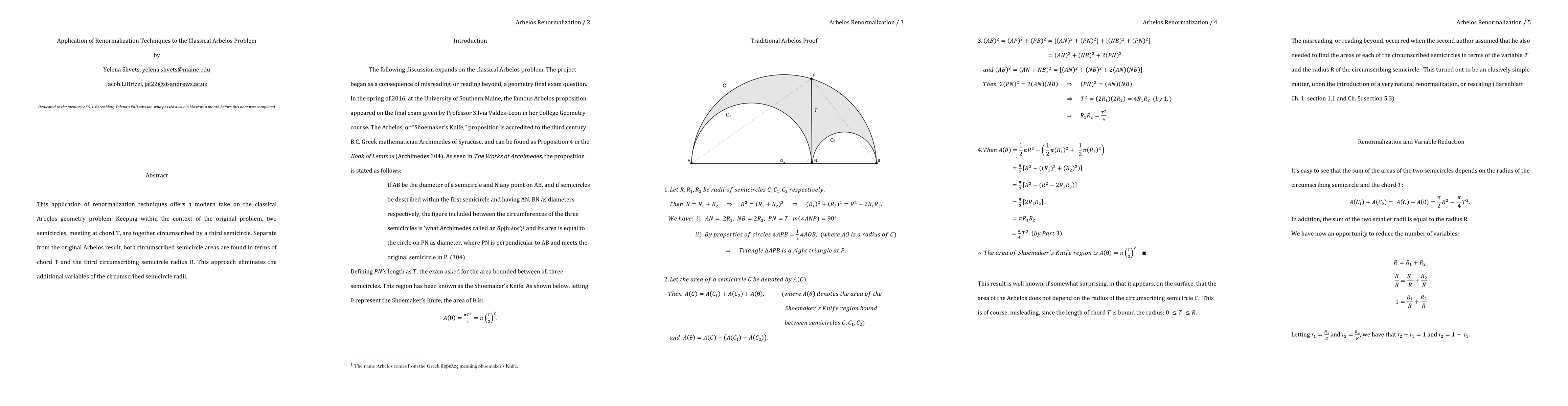 This application of renormalization techniques offers a modern take on the classical Arbelos geometry problem. Keeping within the context of the original problem, two semicircles, meeting at chord T, are together circumscribed by a third semicircle. Separate from the original Arbelos result, both circumscribed semicircle areas are found in terms of chord T and the third circumscribing semicircle radius R. This approach eliminates the additional variables of the circumscribed semicircle radii.