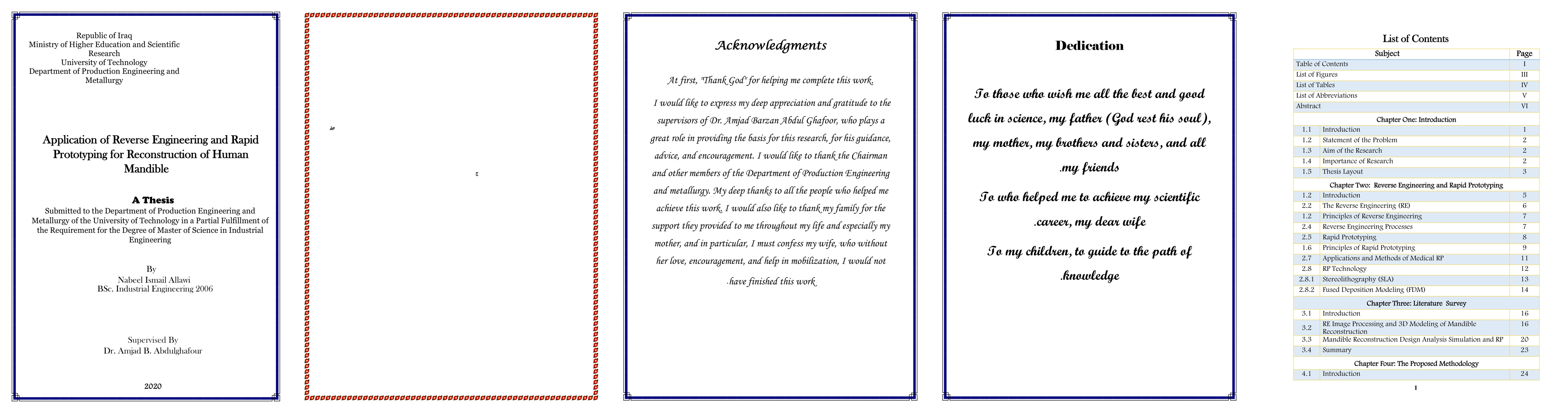 Reconstruction of the mandible is one of the most common challenges facing maxillofacial surgeons. The mandible plays a major role in supporting the teeth inside the mouth. This work aims to develop a proposed methodology for improving reconstructive surgery by using the simulation of a mandibular defect using imaging, design, and fabrication techniques for a custom mandible. The combination of these technologies provides a powerful way to improve and implement the implant process through the design and fabrication of medical models. This work introduces a methodology that the capabilities of Reverse Engineering (RE), Computer-Aided Design (CAD), and Rapid Prototyping Technology (RP) for the reconstruction of the mandible and representing the surgery. Patient examination using a high-resolution technique represented by Cone-beam computed tomography (CBCT), after which a representative digital model of the patient is created to assist in the design process using the 3DSlicer software The patient's implant designed (Defect part) and analyzed using Solidwork.3D models are assembled and implant simulations are performed by (Meshmixer) software, Stereolithography technology (SLA) used as 3D printing technology to fabricate the mandible model the resin. The results of this work show that procedures for mandible reconstruction can be successfully used using the integration of RE / CAD / RP technologies. This integration will support the acceptable symmetry of the face that will be restored by assisting surgeons in planning reconstruction. This work demonstrates the importance of the CAD system in resolving patient damage requirements directly from medical imaging data, as well as the efficiency of RP techniques used in converting 3D model designs into implant models.
