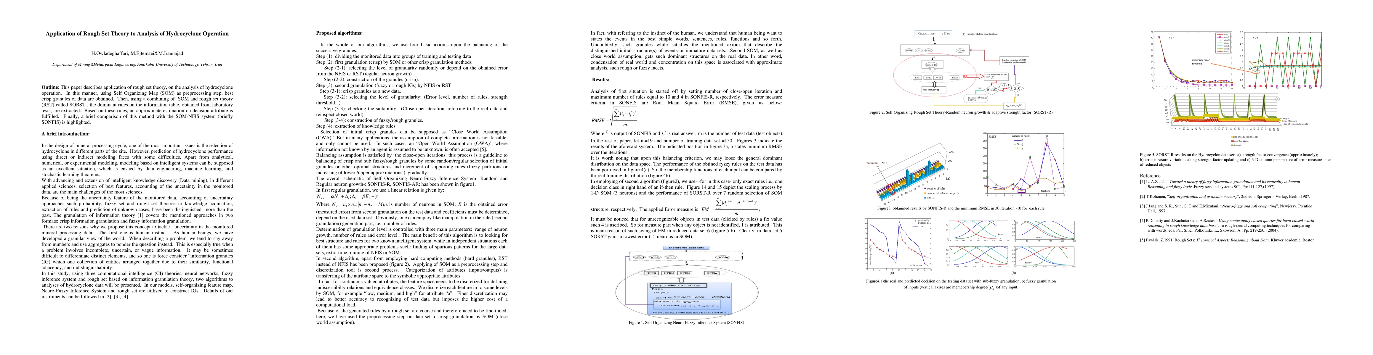 This paper applies rough set theory combined with Self Organizing Map (SOM) to analyze hydrocyclone operation, extracting dominant rules from laboratory data to estimate decision attributes, and compares this method with the SOM-NFIS system.