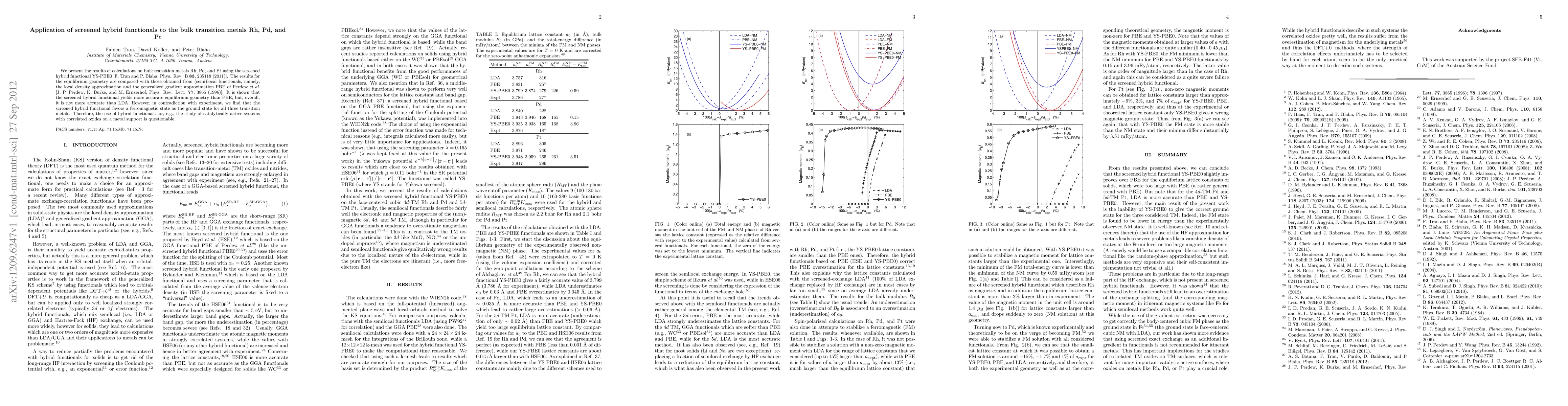 We present the results of calculations on bulk transition metals Rh, Pd, and Pt using the screened hybrid functional YS-PBE0 [F. Tran and P. Blaha, Phys. Rev. B \textbf{83}, 235118 (2011)]. The results for the equilibrium geometry are compared with those obtained from (semi)local functionals, namely, the local density approximation and the generalized gradient approximation PBE of Perdew \textit{et al}. [J. P. Perdew, K. Burke, and M. Ernzerhof, Phys. Rev. Lett. \textbf{77}, 3865 (1996)]. It is shown that the screened hybrid functional yields more accurate equilibrium geometry than PBE, but, overall, it is not more accurate than LDA. However, in contradiction with experiment, we find that the screened hybrid functional favors a ferromagnetic state as the ground state for all three transition metals. Therefore, the use of hybrid functionals for, e.g., the study of catalytically active systems with correlated oxides on a metal support is questionable.