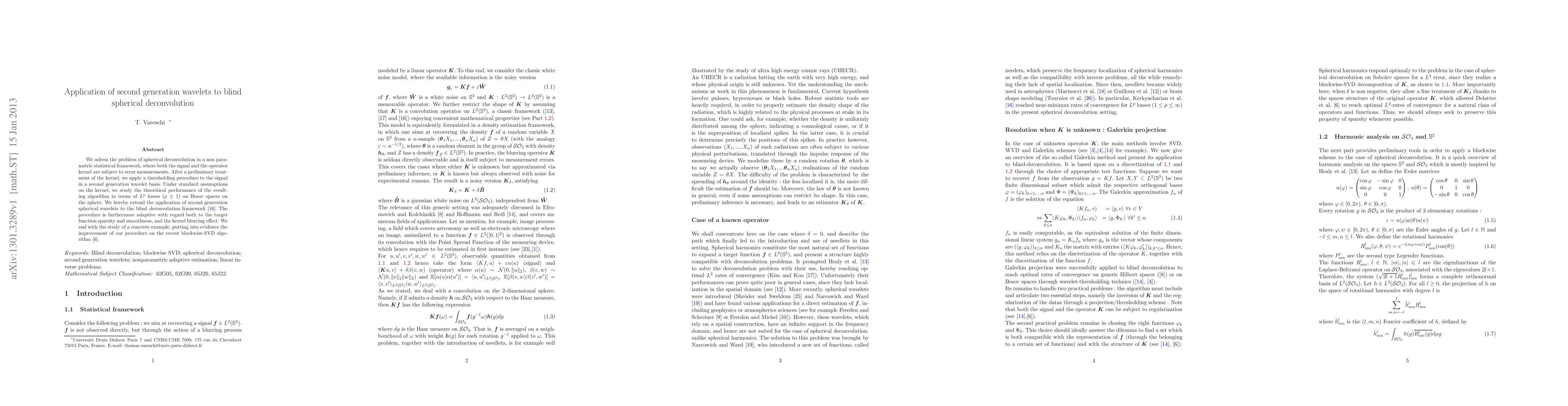 This paper introduces a new method for blind spherical deconvolution using second-generation wavelets, improving performance on signal and kernel error measurements while adapting to target function sparsity and smoothness.