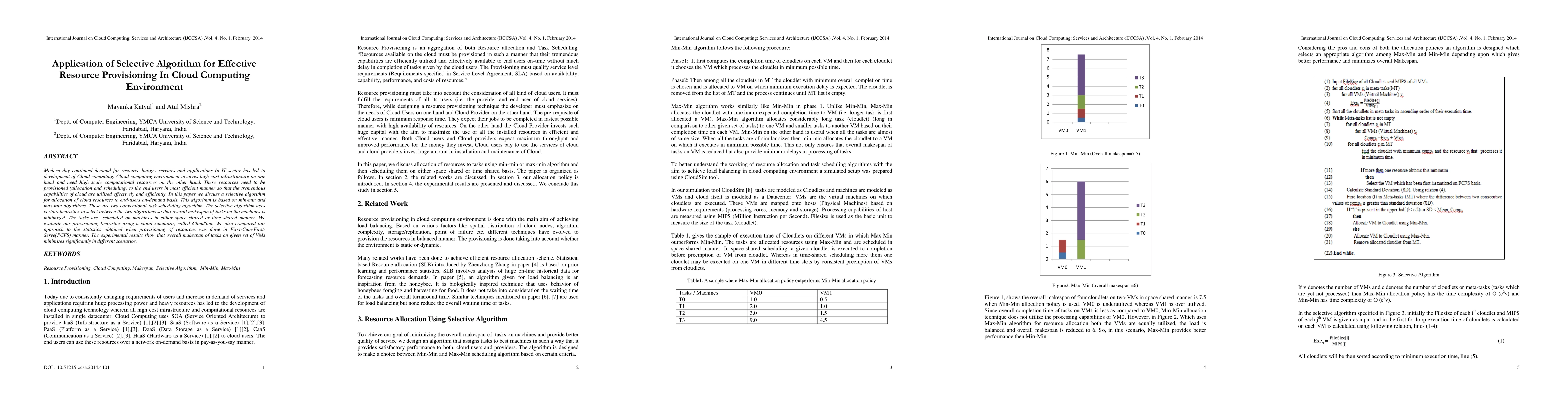This paper proposes a selective algorithm for efficient resource provisioning in cloud computing, combining min-min and max-min scheduling heuristics to minimize overall task makespan. Experimental results using CloudSim show significant improvement over First-Come-First-Serve provisioning.