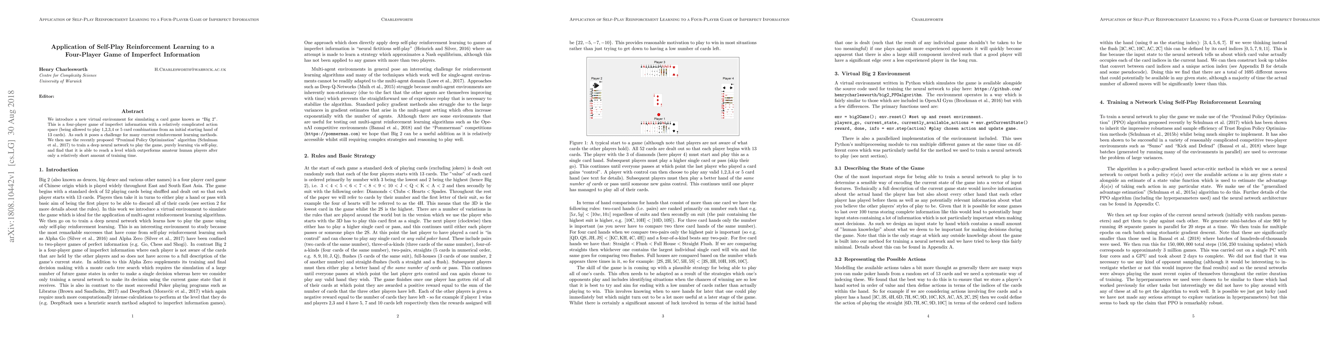 This paper applies the "Proximal Policy Optimization" algorithm to train a deep neural network to play the complex four-player card game "Big 2" through self-play, achieving a level of play that outperforms amateur human players in a relatively short training period without extensive future state search.