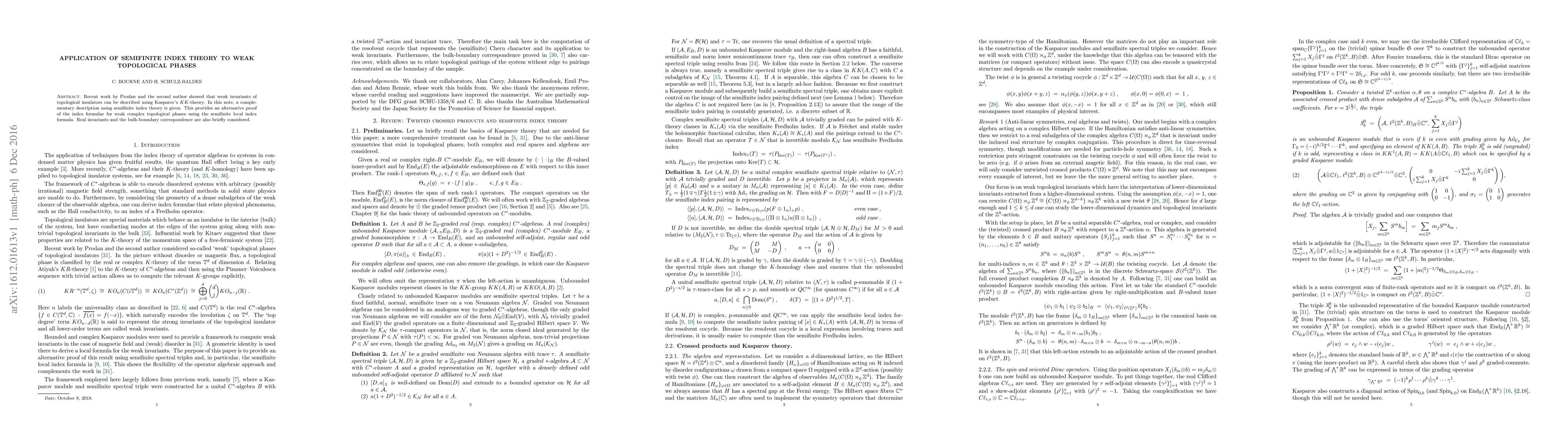 Recent work by Prodan and the second author showed that weak invariants of topological insulators can be described using Kasparov's $KK$-theory. In this note, a complementary description using semifinite index theory is given. This provides an alternative proof of the index formulae for weak complex topological phases using the semifinite local index formula. Real invariants and the bulk-boundary correspondence are also briefly considered.