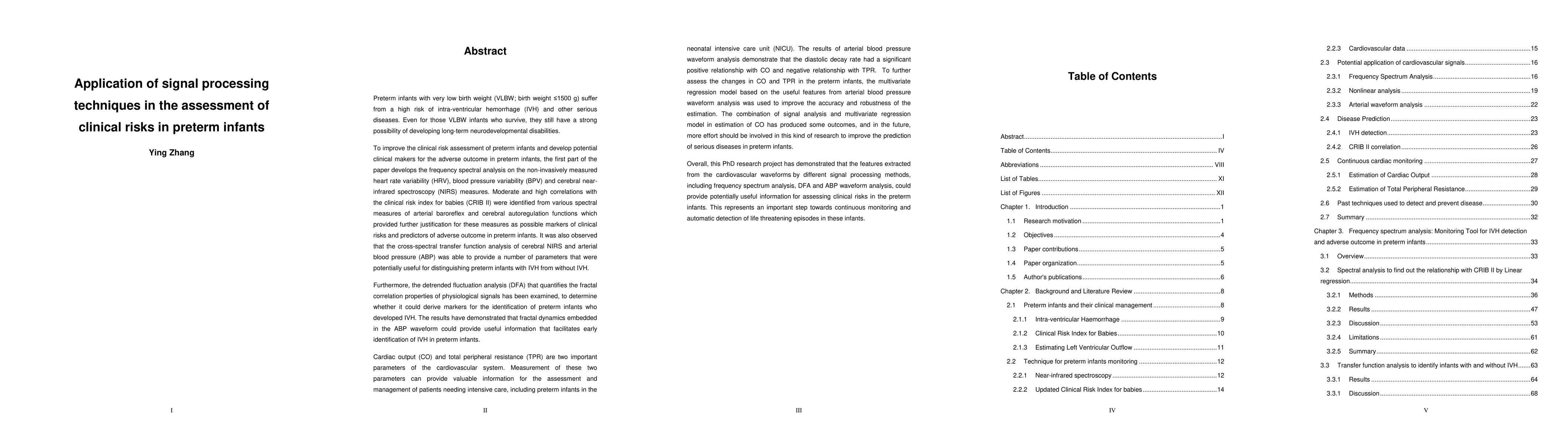 Preterm infants with very low birth weight suffer from a high risk of intra-ventricular hemorrhage(IVH) and other serious diseases. To improve the clinical risk assessment of preterm infants and develop potential clinically makers for the adverse outcome, the first part of the paper develops the frequency spectral analysis on the non-invasively measured heart rate variability, blood pressure variability and cerebral near-infrared spectroscopy measures. Moderate and high correlations with the clinical risk index for babies were identified from various spectral measures of arterial baroreflex and cerebral autoregulation functions. It was also observed that the cross-spectral transfer function analysis of cerebral NIRS and arterial blood pressure was able to provide a number of parameters that were potentially useful for distinguishing between preterm infants with or without IVH. Furthermore, the detrended fluctuation analysis that quantifies the fractal correlation properties of physiological signals has been examined, to determine whether it could derive markers for the identification of preterm infants with IVH. Cardiac output(CO) and total peripheral resistance(TPR) are two important parameters of the cardiovascular system. Measurement of these two parameters can provide valuable information for the assessment and management of patients needing intensive care, including preterm infants in the neonatal intensive care unit. To further assess the changes in CO and TPR in the preterm infants, the multivariate regression model based on the useful features from ABP method was used to improve the accuracy and robustness of the estimation. The combination of signal analysis and multivariate regression model in estimation of CO has produced some outcomes, and in the future, more effort should be involved in this kind of research to improve the prediction of serious diseases in preterm infants.