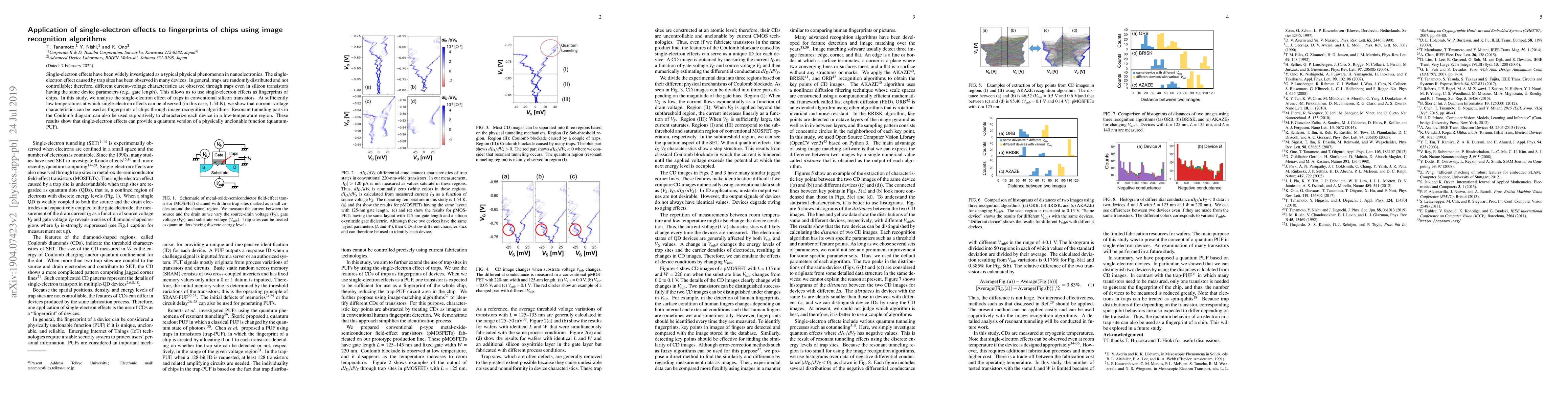 Single-electron effects have been widely investigated as a typical physical phenomenon in nanoelectronics. The single-electron effect caused by trap sites has been observed in many devices. In general, traps are randomly distributed and not controllable; therefore, different current--voltage characteristics are observed through traps even in silicon transistors having the same device parameters (e.g., gate length). This allows us to use single-electron effects as fingerprints of chips. In this study, we analyze the single-electron effect of traps in conventional silicon transistors and show the possibility of their use as fingerprints of chips through image recognition algorithms. Resonant tunneling parts in the Coulomb diagram can also be used to characterize each device. These results show that single-electron effects can provide a quantum version of a physically unclonable function (quantum-PUF).
