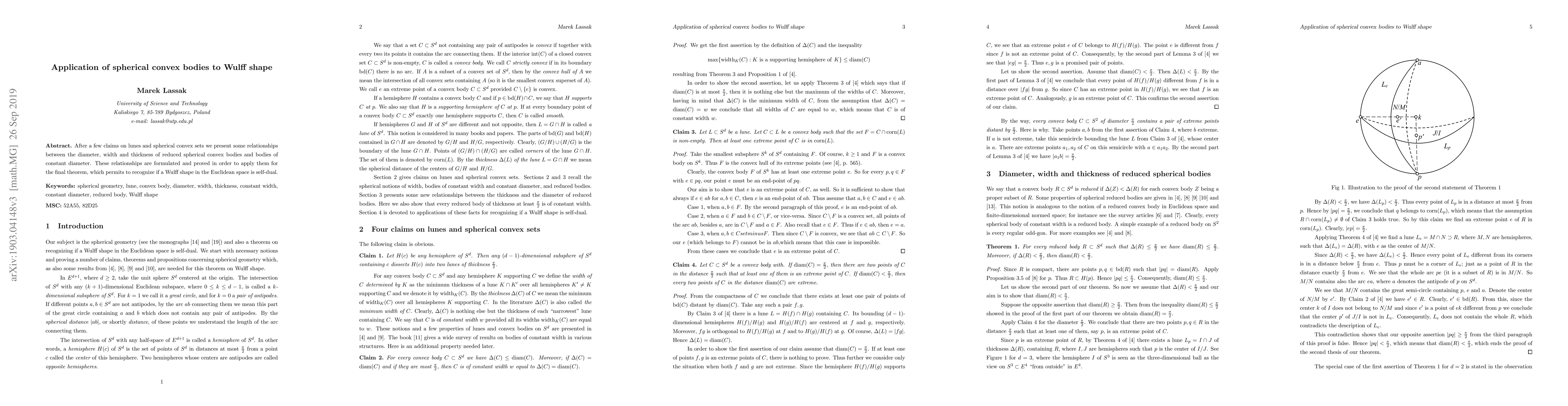 The paper explores relationships between diameter, width, and thickness of reduced convex bodies on the d-dimensional sphere, applying these properties to recognize self-dual Wulff shapes in Euclidean d-space.