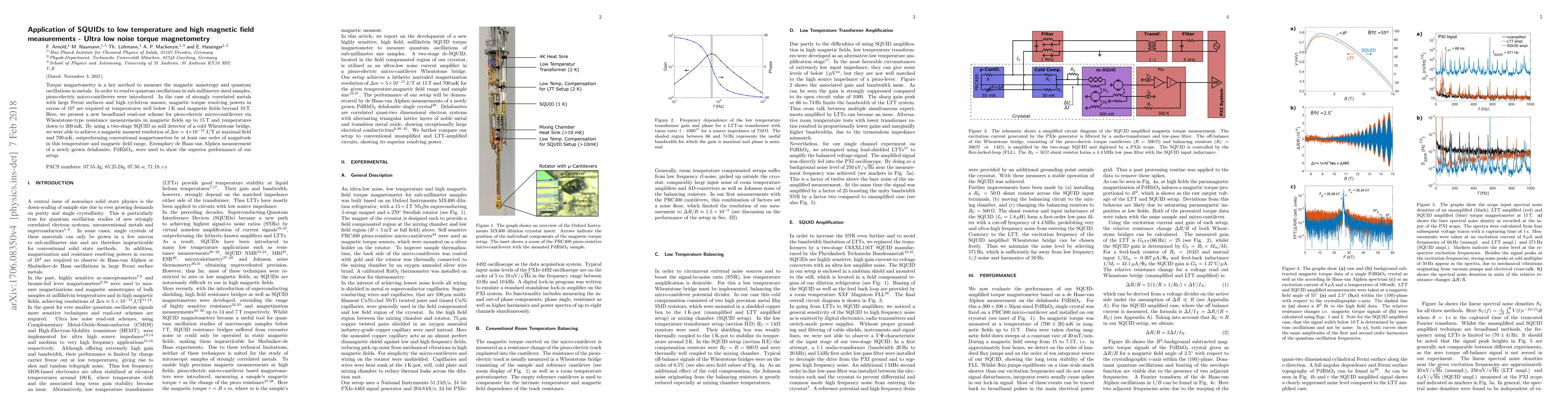 This paper introduces a novel SQUID-based torque magnetometry technique for ultra-low noise measurements in low temperatures and high magnetic fields, achieving a magnetic moment resolution of $5\times10^{-15}\,\mathrm{J/T}$ and demonstrating its effectiveness through de Haas-van Alphen measurements on PdRhO$_2$.