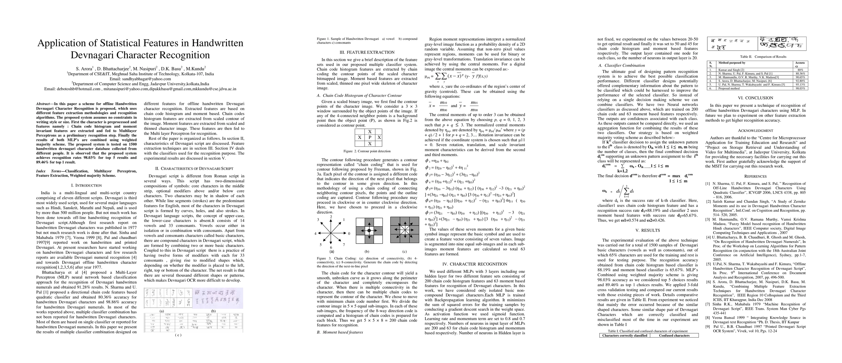 In this paper a scheme for offline Handwritten Devnagari Character Recognition is proposed, which uses different feature extraction methodologies and recognition algorithms. The proposed system assumes no constraints in writing style or size. First the character is preprocessed and features namely : Chain code histogram and moment invariant features are extracted and fed to Multilayer Perceptrons as a preliminary recognition step. Finally the results of both MLP's are combined using weighted majority scheme. The proposed system is tested on 1500 handwritten devnagari character database collected from different people. It is observed that the proposed system achieves recognition rates 98.03% for top 5 results and 89.46% for top 1 result.