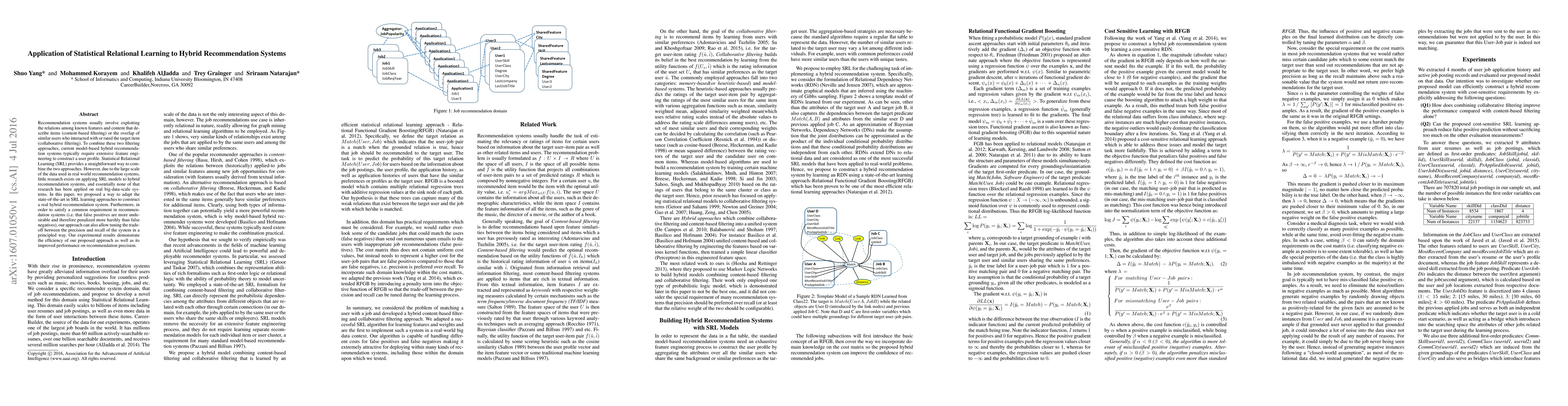 Recommendation systems usually involve exploiting the relations among known features and content that describe items (content-based filtering) or the overlap of similar users who interacted with or rated the target item (collaborative filtering). To combine these two filtering approaches, current model-based hybrid recommendation systems typically require extensive feature engineering to construct a user profile. Statistical Relational Learning (SRL) provides a straightforward way to combine the two approaches. However, due to the large scale of the data used in real world recommendation systems, little research exists on applying SRL models to hybrid recommendation systems, and essentially none of that research has been applied on real big-data-scale systems. In this paper, we proposed a way to adapt the state-of-the-art in SRL learning approaches to construct a real hybrid recommendation system. Furthermore, in order to satisfy a common requirement in recommendation systems (i.e. that false positives are more undesirable and therefore penalized more harshly than false negatives), our approach can also allow tuning the trade-off between the precision and recall of the system in a principled way. Our experimental results demonstrate the efficiency of our proposed approach as well as its improved performance on recommendation precision.