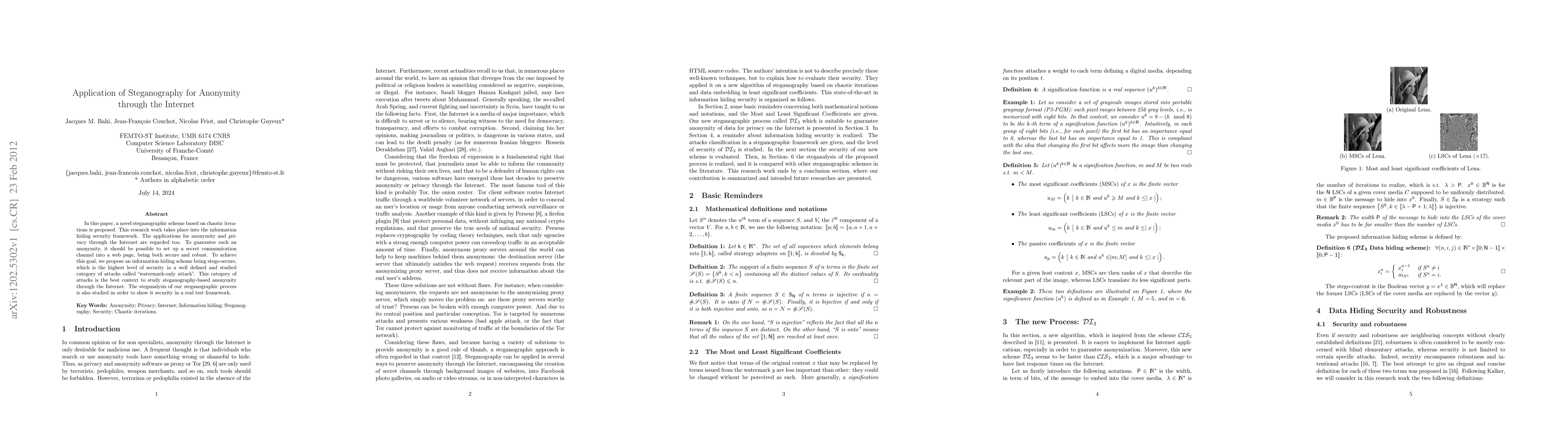 In this paper, a novel steganographic scheme based on chaotic iterations is proposed. This research work takes place into the information hiding security framework. The applications for anonymity and privacy through the Internet are regarded too. To guarantee such an anonymity, it should be possible to set up a secret communication channel into a web page, being both secure and robust. To achieve this goal, we propose an information hiding scheme being stego-secure, which is the highest level of security in a well defined and studied category of attacks called "watermark-only attack". This category of attacks is the best context to study steganography-based anonymity through the Internet. The steganalysis of our steganographic process is also studied in order to show it security in a real test framework.