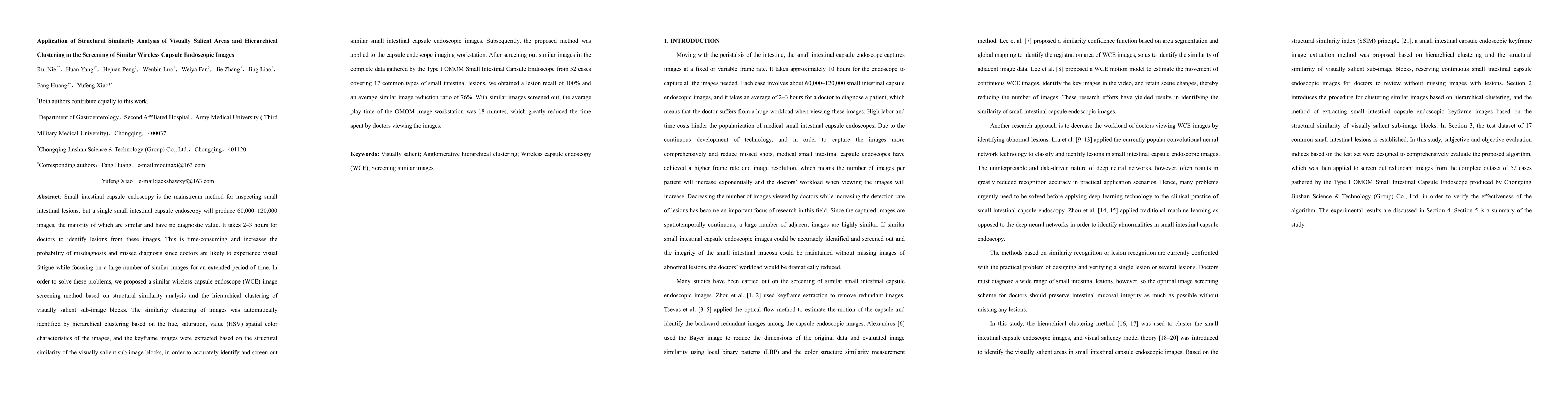 Small intestinal capsule endoscopy is the mainstream method for inspecting small intestinal lesions,but a single small intestinal capsule endoscopy will produce 60,000 - 120,000 images, the majority of which are similar and have no diagnostic value. It takes 2 - 3 hours for doctors to identify lesions from these images. This is time-consuming and increase the probability of misdiagnosis and missed diagnosis since doctors are likely to experience visual fatigue while focusing on a large number of similar images for an extended period of time.In order to solve these problems, we proposed a similar wireless capsule endoscope (WCE) image screening method based on structural similarity analysis and the hierarchical clustering of visually salient sub-image blocks. The similarity clustering of images was automatically identified by hierarchical clustering based on the hue,saturation,value (HSV) spatial color characteristics of the images,and the keyframe images were extracted based on the structural similarity of the visually salient sub-image blocks, in order to accurately identify and screen out similar small intestinal capsule endoscopic images. Subsequently, the proposed method was applied to the capsule endoscope imaging workstation. After screening out similar images in the complete data gathered by the Type I OMOM Small Intestinal Capsule Endoscope from 52 cases covering 17 common types of small intestinal lesions, we obtained a lesion recall of 100% and an average similar image reduction ratio of 76%. With similar images screened out, the average play time of the OMOM image workstation was 18 minutes, which greatly reduced the time spent by doctors viewing the images.