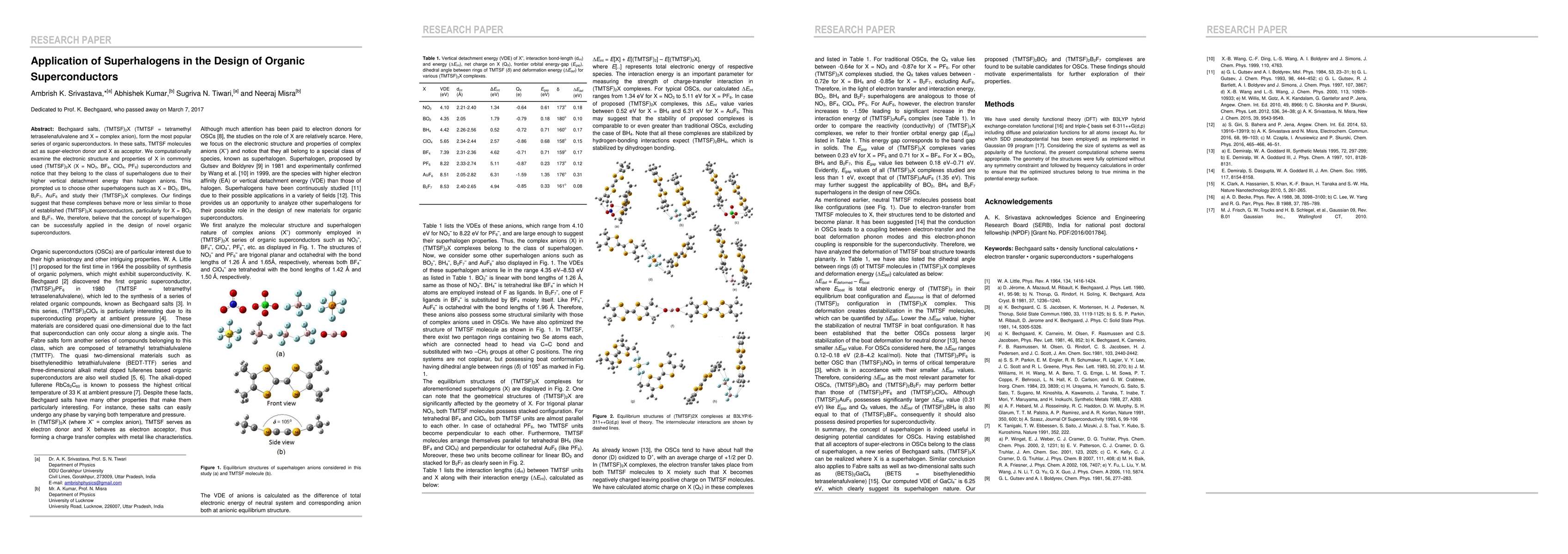 The research explores the use of superhalogens, with higher vertical detachment energy than halogens, in designing organic superconductors. Computational examination reveals that complexes with superhalogens like BO2 and B2F7 exhibit properties similar to established superconductors, suggesting a promising approach for creating novel organic superconductors.