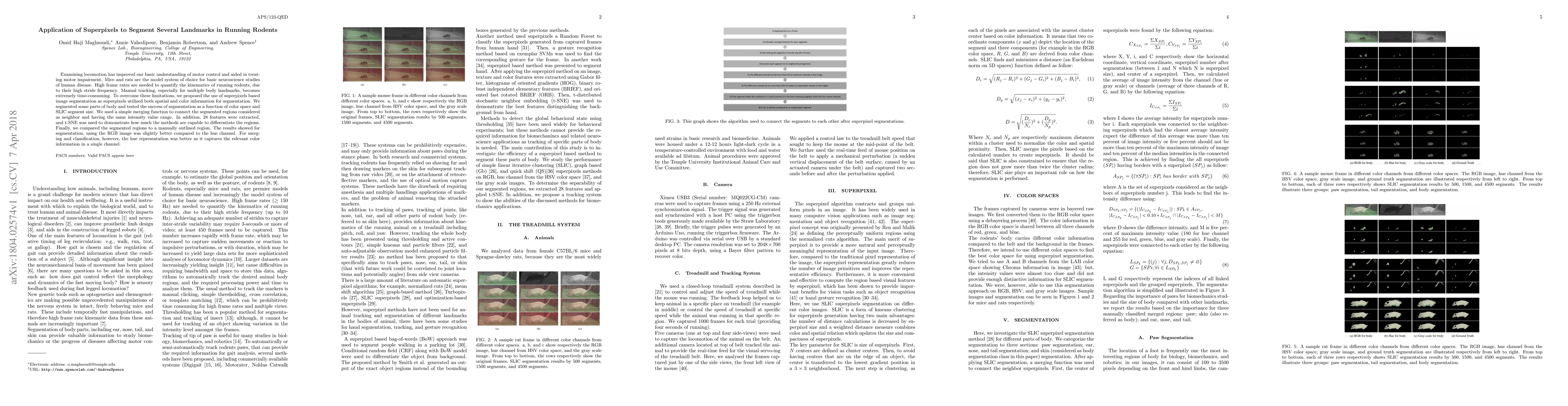 Examining locomotion has improved our basic understanding of motor control and aided in treating motor impairment. Mice and rats are the model system of choice for basic neuroscience studies of human disease. High frame rates are needed to quantify the kinematics of running rodents, due to their high stride frequency. Manual tracking, especially for multiple body landmarks, becomes extremely time-consuming. To overcome these limitations, we proposed the use of superpixels based image segmentation as superpixels utilized both spatial and color information for segmentation. We segmented some parts of body and tested the success of segmentation as a function of color space and SLIC segment size. We used a simple merging function to connect the segmented regions considered as neighbor and having the same intensity value range. In addition, 28 features were extracted, and t-SNE was used to demonstrate how much the methods are capable to differentiate the regions. Finally, we compared the segmented regions to a manually outlined region. The results showed for segmentation, using the RGB image was slightly better compared to the hue channel. For merg- ing and classification, however, the hue representation was better as it captures the relevant color information in a single channel.