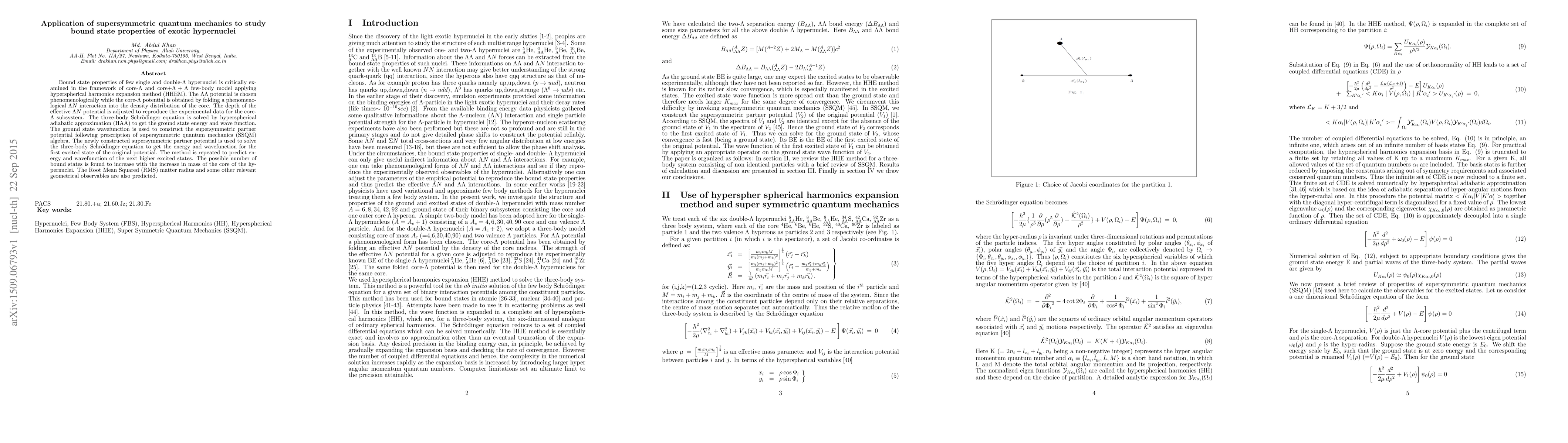 This paper applies supersymmetric quantum mechanics to investigate the bound state properties of exotic hypernuclei, using a few-body model and hyperspherical harmonics. The study predicts the energy levels and wavefunctions of the ground and excited states, finding that the number of bound states increases with the mass of the core, and also calculates geometrical observables like RMS matter radius.