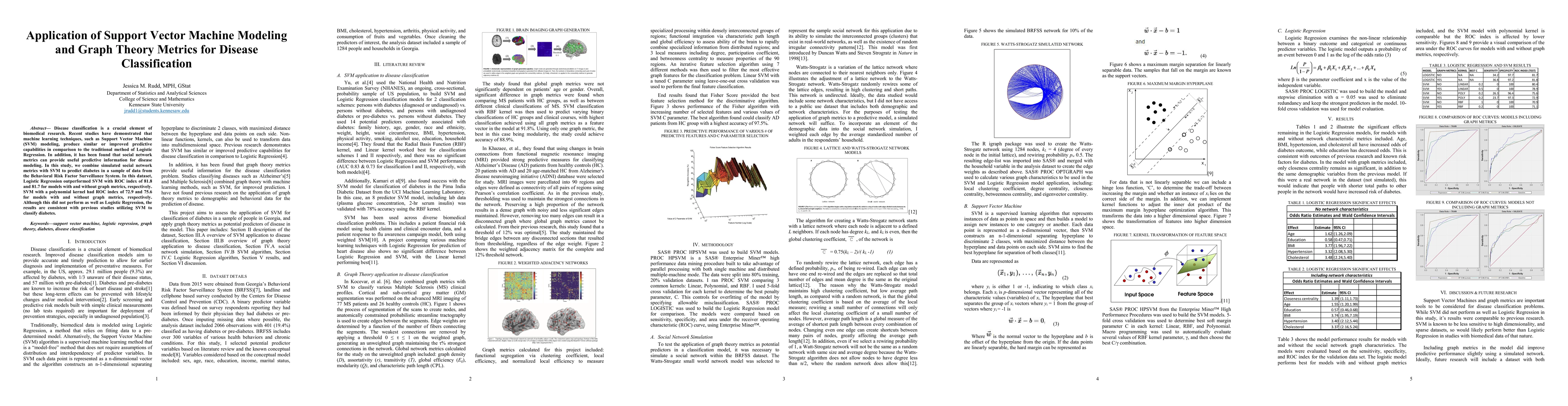 Disease classification is a crucial element of biomedical research. Recent studies have demonstrated that machine learning techniques, such as Support Vector Machine (SVM) modeling, produce similar or improved predictive capabilities in comparison to the traditional method of Logistic Regression. In addition, it has been found that social network metrics can provide useful predictive information for disease modeling. In this study, we combine simulated social network metrics with SVM to predict diabetes in a sample of data from the Behavioral Risk Factor Surveillance System. In this dataset, Logistic Regression outperformed SVM with ROC index of 81.8 and 81.7 for models with and without graph metrics, respectively. SVM with a polynomial kernel had ROC index of 72.9 and 75.6 for models with and without graph metrics, respectively. Although this did not perform as well as Logistic Regression, the results are consistent with previous studies utilizing SVM to classify diabetes.