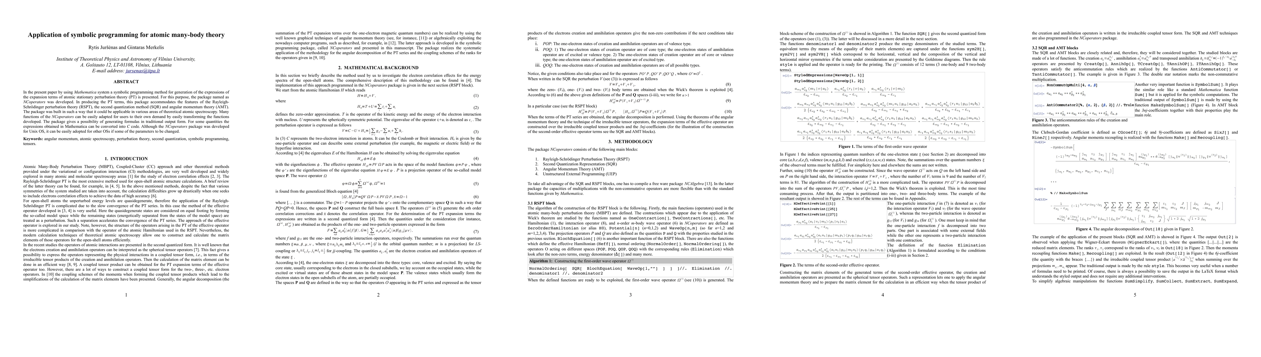 This paper introduces a symbolic programming method using Mathematica to generate expressions for atomic stationary perturbation theory, developed through a package called NCoperators. The package integrates features from Rayleigh-Schrödinger perturbation theory, second quantization, and angular momentum theory, and can be adapted for various theoretical atomic spectroscopy applications.