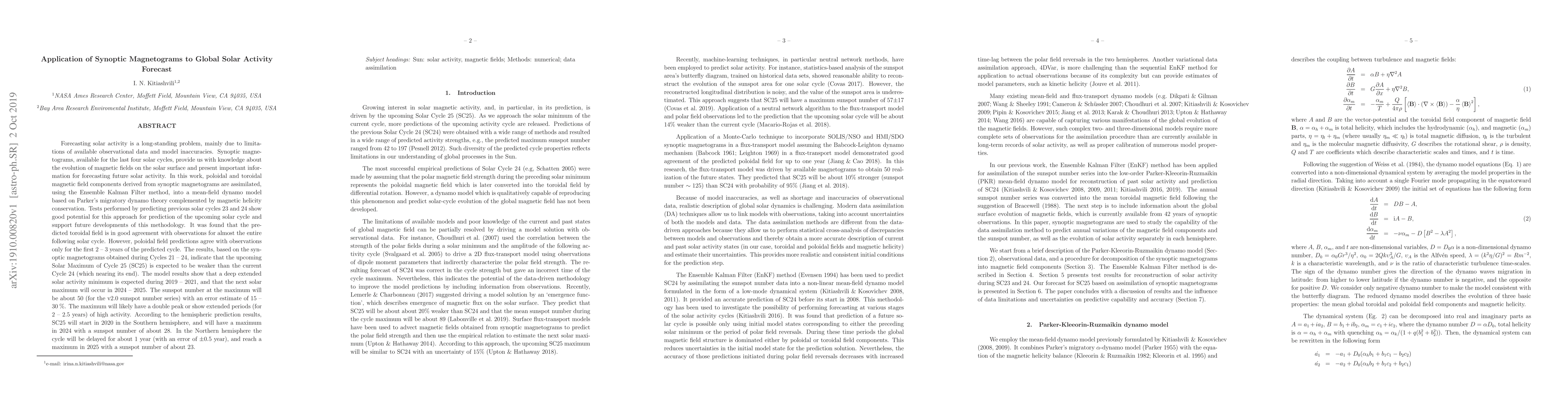 Synoptic magnetograms provide us with knowledge about the evolution of magnetic fields on the solar surface and present important information for forecasting future solar activity. In this work, poloidal and toroidal magnetic field components derived from synoptic magnetograms are assimilated, using the Ensemble Kalman Filter method, into a mean-field dynamo model based on Parker's migratory dynamo theory complemented by magnetic helicity conservation. It was found that the predicted toroidal field is in good agreement with observations for almost the entire following solar cycle. However, poloidal field predictions agree with observations only for the first 2 - 3 years of the predicted cycle. The results indicate that the upcoming Solar Maximum of Cycle 25 (SC25) is expected to be weaker than the current Cycle 24. The model results show that a deep extended solar activity minimum is expected during 2019 - 2021, and that the next solar maximum will occur in 2024 - 2025. The sunspot number at the maximum will be about 50 with an error estimate of 15 - 30 %. The maximum will likely have a double peak or show extended periods (for 2 - 2.5 years) of high activity. According to the hemispheric prediction results, SC25 will start in 2020 in the Southern hemisphere, and will have a maximum in 2024 with a sunspot number of about 28. In the Northern hemisphere the cycle will be delayed for about 1 year (with an error of $\pm 0.5$ year), and reach a maximum in 2025 with a sunspot number of about 23.