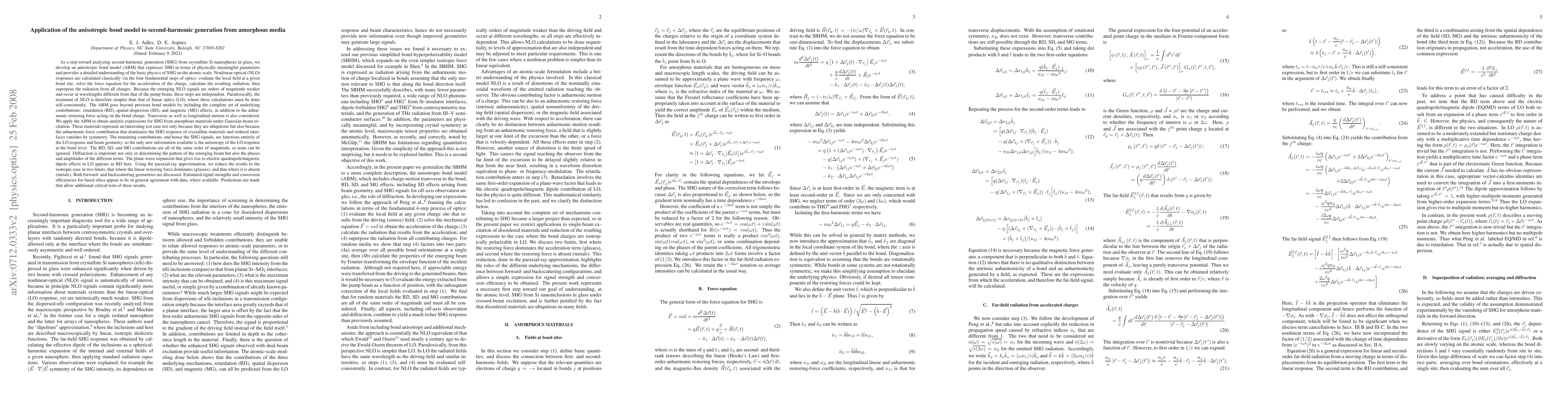 As a step toward analyzing second-harmonic generation (SHG) from crystalline Si nanospheres in glass, we develop an anisotropic bond model (ABM) that expresses SHG in terms of physically meaningful parameters and provides a detailed understanding of the basic physics of SHG on the atomic scale. Nonlinear-optical (NLO) responses are calculated classically via the four fundamental steps of optics: evaluate the local field at a given bond site, solve the force equation for the acceleration of the charge, calculate the resulting radiation, then superpose the radiation from all charges. The ABM goes beyond previous bond models by including the complete set of underlying contributions: retardation (RD), spatial-dispersion (SD), and magnetic (MG) effects, in addition to the anharmonic restoring force acting on the bond charge. We apply the ABM to obtain analytic expressions for SHG from amorphous materials under Gaussian-beam excitation. These materials represent an interesting test case not only because they are ubiquitous but also because the anharmonic-force contribution that dominates the SHG response of crystalline materials and ordered interfaces vanishes by symmetry. Using the paraxial-ray approximation, we reduce the results to the isotropic case in two limits, that where the linear restoring force dominates (glasses), and that where it is absent (metals). Both forward- and backscattering geometries are discussed. Estimated signal strengths and conversion efficiencies for fused silica appear to be in general agreement with data, where available. Predictions are made that allow additional critical tests of these results.