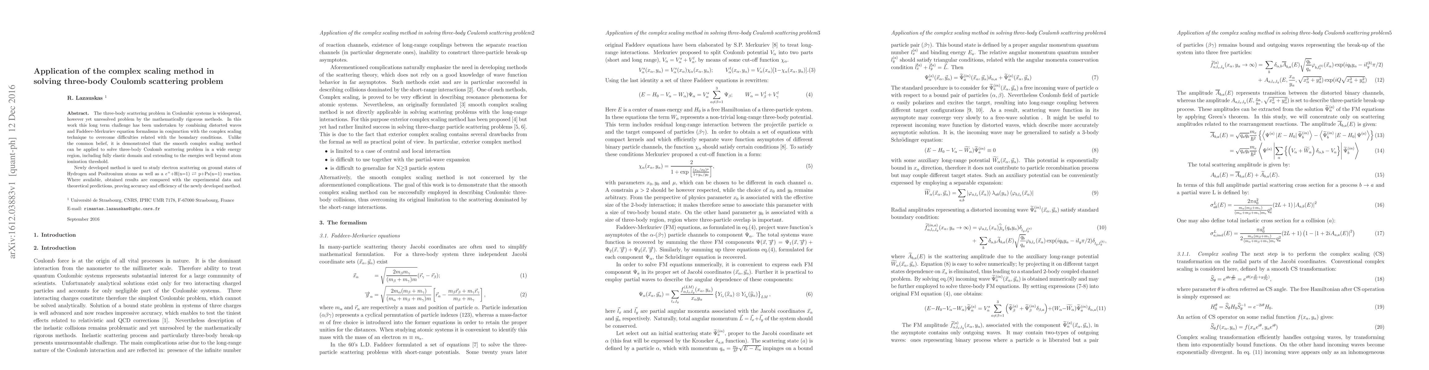 This paper presents a novel method combining complex scaling, distorted waves, and the Faddeev-Merkuriev equation to rigorously solve the three-body Coulomb scattering problem. The proposed approach demonstrates accuracy and efficiency in studying electron scattering on Hydrogen and Positronium atoms, as well as the $e^+ + H(n=1) \rightleftarrows p + Ps(n=1)$ reaction, validated by comparison with experimental and theoretical data.