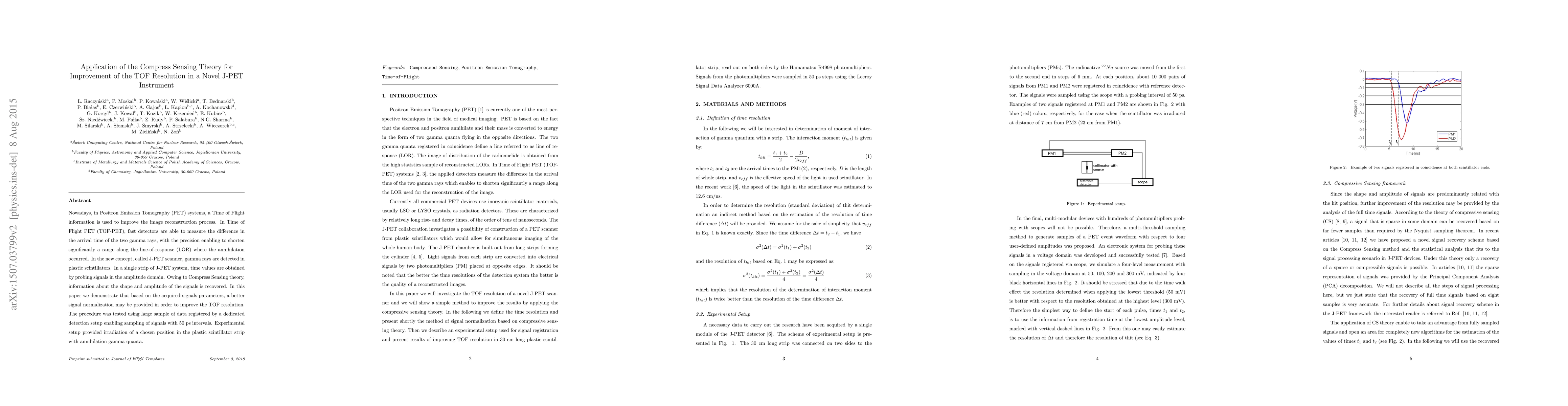 This paper explores the application of Compress Sensing Theory to enhance Time of Flight (TOF) resolution in a novel J-PET scanner. By utilizing Compress Sensing to recover signal shape and amplitude, the study demonstrates improved TOF resolution through better signal normalization, validated with a large dataset from a dedicated detection setup.