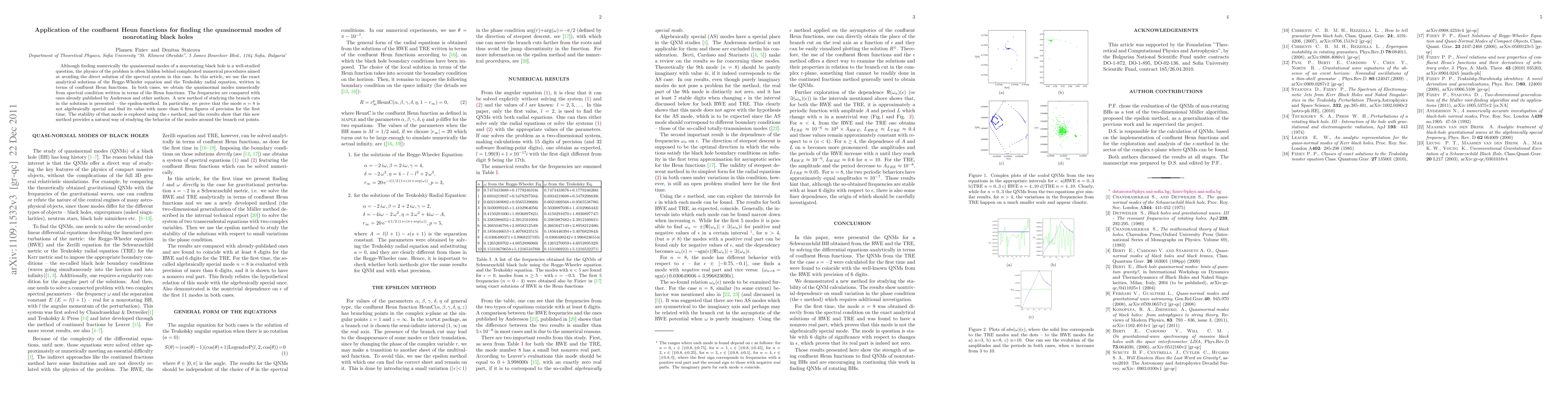 Although finding numerically the quasinormal modes of a nonrotating black hole is a well-studied question, the physics of the problem is often hidden behind complicated numerical procedures aimed at avoiding the direct solution of the spectral system in this case. In this article, we use the exact analytical solutions of the Regge-Wheeler equation and the Teukolsky radial equation, written in terms of confluent Heun functions. In both cases, we obtain the quasinormal modes numerically from spectral condition written in terms of the Heun functions. The frequencies are compared with ones already published by Andersson and other authors. A new method of studying the branch cuts in the solutions is presented -- the epsilon-method. In particular, we prove that the mode $n=8$ is not algebraically special and find its value with more than 6 firm figures of precision for the first time. The stability of that mode is explored using the $\epsilon$ method, and the results show that this new method provides a natural way of studying the behavior of the modes around the branch cut points.