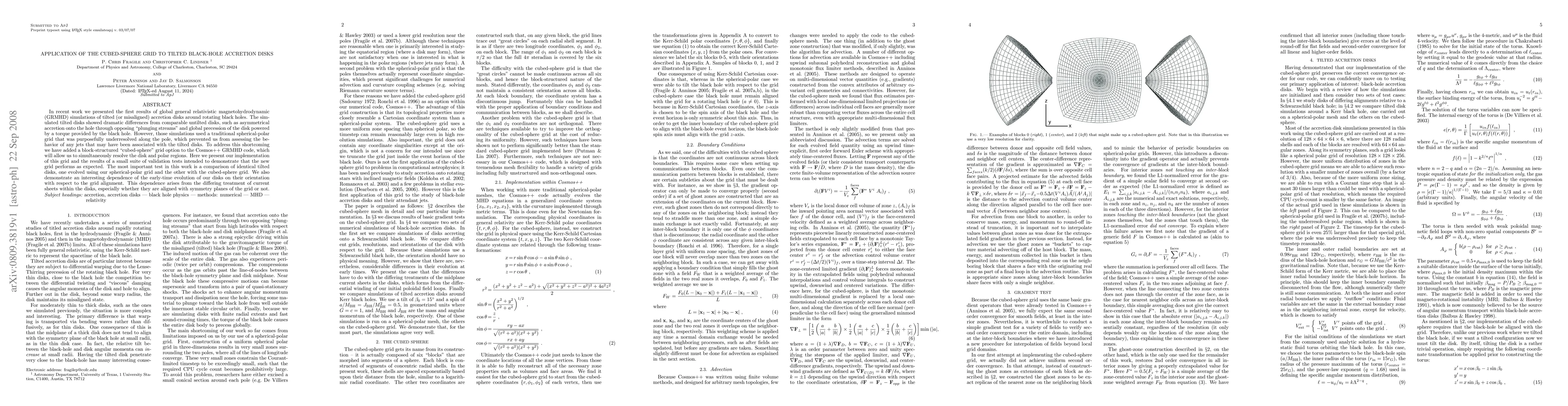 This paper introduces a cubed-sphere grid implementation in the Cosmos++ GRMHD code to better resolve tilted black-hole accretion disks, addressing previous limitations of spherical-polar grids. The new grid allows for simultaneous resolution of both disk and polar regions, enabling a detailed study of disk precession and jet formation.