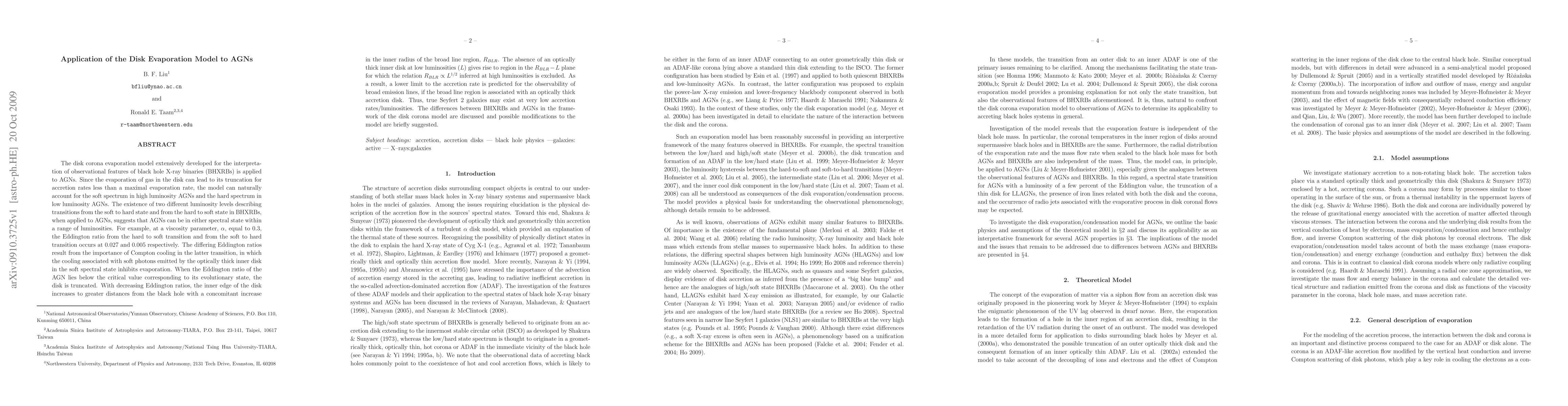 The disk corona evaporation model extensively developed for the interpretation of observational features of black hole X-ray binaries (BHXRBs) is applied to AGNs. Since the evaporation of gas in the disk can lead to its truncation for accretion rates less than a maximal evaporation rate, the model can naturally account for the soft spectrum in high luminosity AGNs and the hard spectrum in low luminosity AGNs. The existence of two different luminosity levels describing transitions from the soft to hard state and from the hard to soft state in BHXRBs, when applied to AGNs, suggests that AGNs can be in either spectral state within a range of luminosities. For example, at a viscosity parameter, \alpha, equal to 0.3, the Eddington ratio from the hard to soft transition and from the soft to hard transition occurs at 0.027 and 0.005 respectively. When the Eddington ratio of the AGN lies below the critical value corresponding to its evolutionary state, the disk is truncated. With decreasing Eddington ratios, the inner edge of the disk increases to greater distances from the black hole with a concomitant increase in the inner radius of the broad line region, $R_{BLR}$. The absence of an optically thick inner disk at low luminosities gives rise to region in the size of borad line-luminosity plane for which the relation $R_{BLR} \propto L^{1/2}$ inferred at high luminosities is excluded. As a result, a lower limit to the accretion rate is predicted for the observability of broad emission lines, if the broad line region is associated with an optically thick accretion disk. Thus, true Seyfert 2 galaxies may exist at very low accretion rates/luminosities. The differences between BHXRBs and AGNs in the framework of the disk corona model are discussed and possible modifications to the model are briefly suggested.