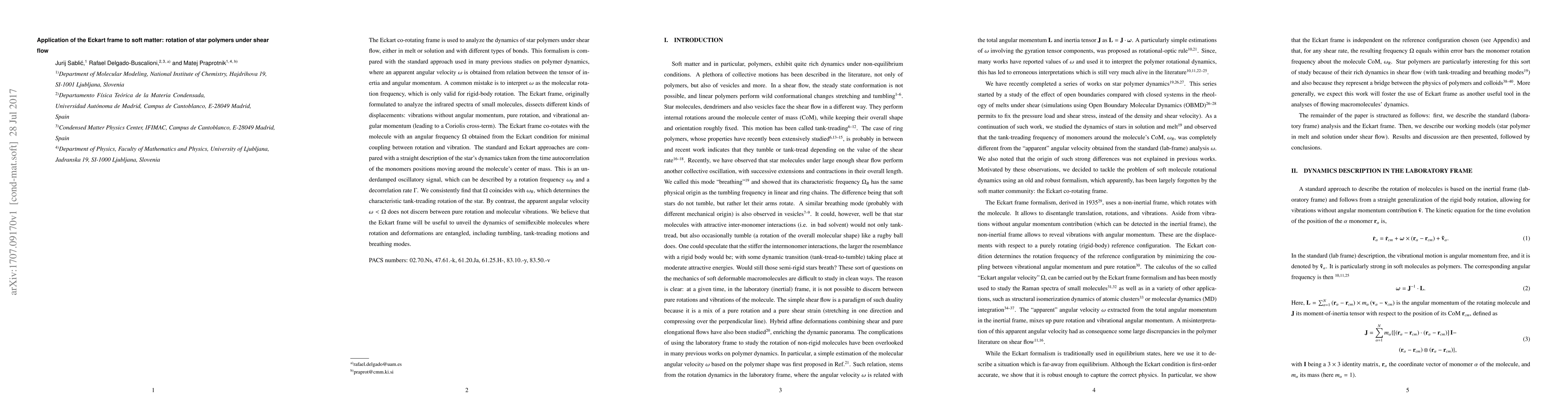 The Eckart co-rotating frame is used to analyze the dynamics of star polymers under shear flow, either in melt or solution and with different types of bonds. This formalism is compared with the standard approach used in many previous studies on polymer dynamics, where an apparent angular velocity $\omega$ is obtained from relation between the tensor of inertia and angular momentum. A common mistake is to interpret $\omega$ as the molecular rotation frequency, which is only valid for rigid-body rotation. The Eckart frame, originally formulated to analyze the infrared spectra of small molecules, dissects different kinds of displacements: vibrations without angular momentum, pure rotation, and vibrational angular momentum (leading to a Coriolis cross-term). The Eckart frame co-rotates with the molecule with an angular frequency $\Omega$ obtained from the Eckart condition for minimal coupling between rotation and vibration. The standard and Eckart approaches are compared with a straight description of the star's dynamics taken from the time autocorrelation of the monomers positions moving around the molecule's center of mass. This is an underdamped oscillatory signal, which can be described by a rotation frequency $\omega_R$ and a decorrelation rate $\Gamma$. We consistently find that $\Omega$ coincides with $\omega_R$, which determines the characteristic tank-treading rotation of the star. By contrast, the apparent angular velocity $\omega < \Omega$ does not discern between pure rotation and molecular vibrations. We believe that the Eckart frame will be useful to unveil the dynamics of semiflexible molecules where rotation and deformations are entangled, including tumbling, tank-treading motions and breathing modes.