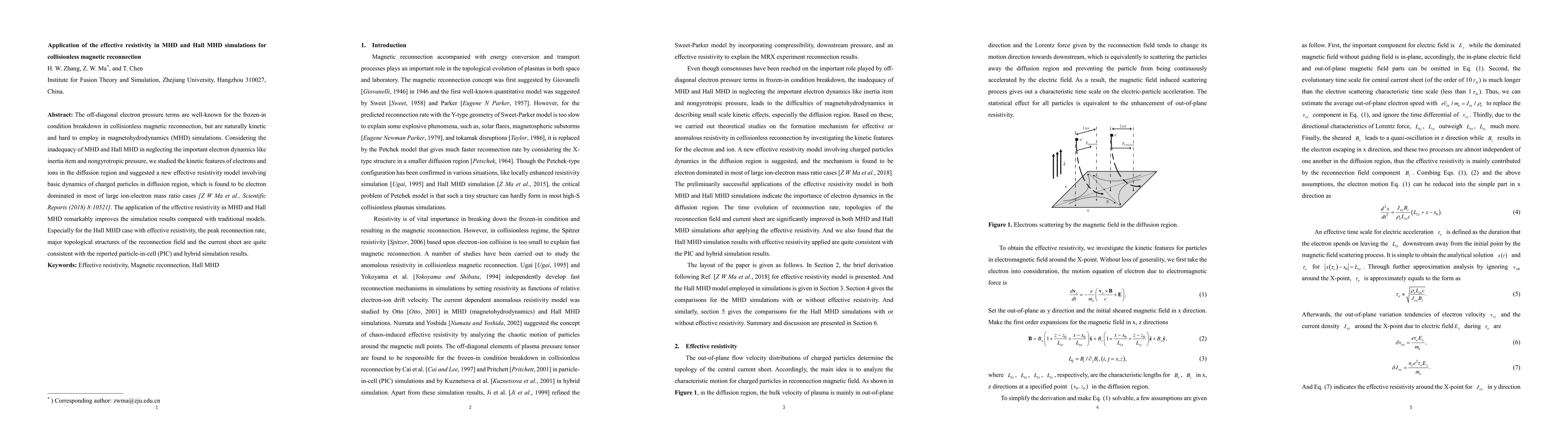 The off-diagonal electron pressure terms are well-known for the frozen-in condition breakdown in collisionless magnetic reconnection, but are naturally kinetic and hard to employ in magnetohydrodynamics (MHD) simulations. Considering the inadequacy of MHD and Hall MHD in neglecting the important electron dynamics like inertia item and nongyrotropic pressure, we studied the kinetic features of electrons and ions in the diffusion region and suggested a new effective resistivity model involving basic dynamics of charged particles in diffusion region, which is found to be electron dominated in most of large ion-electron mass ratio cases [Z W Ma et al., Scientific Reports (2018) 8:10521]. The application of the effective resistivity in MHD and Hall MHD remarkably improves the simulation results compared with traditional models. Especially for the Hall MHD case with effective resistivity, the peak reconnection rate, major topological structures of the reconnection field and the current sheet are quite consistent with the reported particle-in-cell (PIC) and hybrid simulation results.