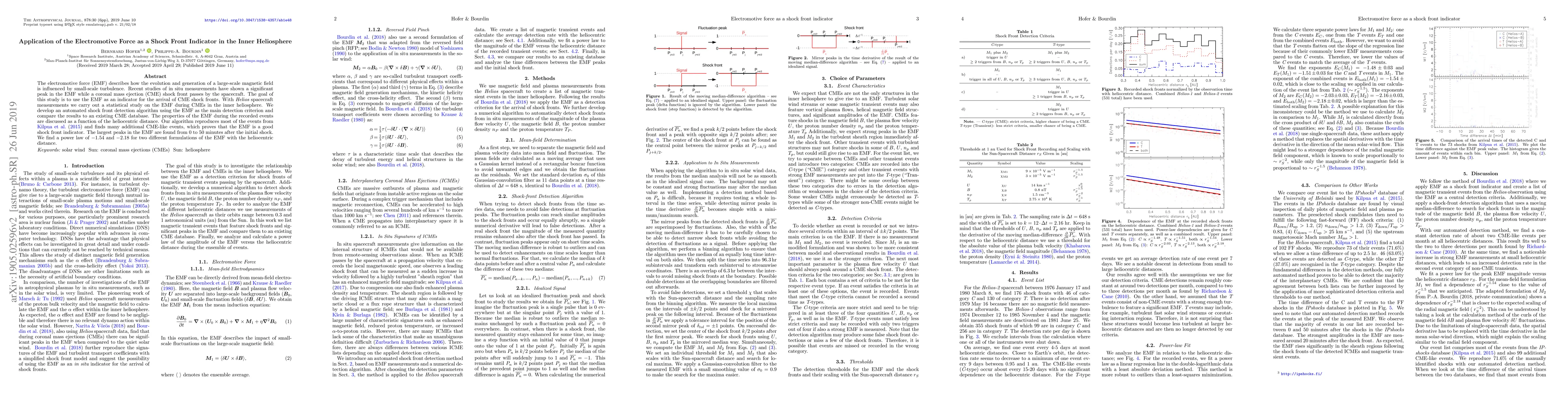 The electromotive force (EMF) describes how the evolution and generation of a large-scale magnetic field is influenced by small-scale turbulence. Recent studies of in-situ measurements have shown a significant peak in the EMF while a coronal mass ejection (CME) shock front passes by the spacecraft. The goal of this study is to use the EMF as an indicator for the arrival of CME shock fronts. With Helios spacecraft measurements we carry out a statistical study on the EMF during CMEs in the inner heliosphere. We develop an automated shock front detection algorithm using the EMF as the main detection criterion and compare the results to an existing CME database. The properties of the EMF during the recorded events are discussed as a function of the heliocentric distance. Our algorithm reproduces most of the the events from Kilpua et al. (2015) and finds many additional CME-like events which proves the EMF as a good shock front indicator. The largest peaks in the EMF are found from 0 to 50 minutes after the initial shock. We find a power law of -1.54 and -2.18 for two different formulations of the EMF with the heliocentric distance.