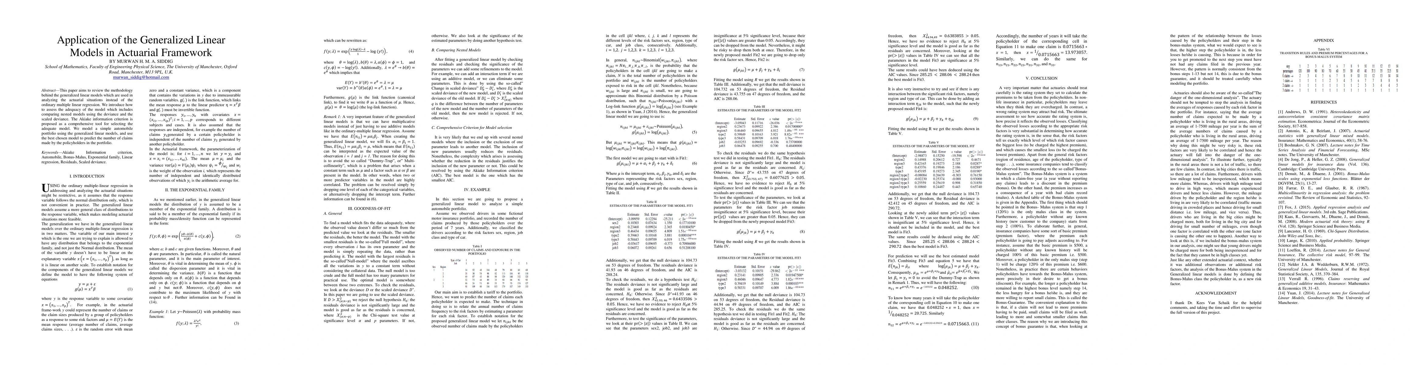 This paper reviews the generalized linear models for actuarial analysis, comparing nested models using deviance and proposing the Akaike information criterion for model selection. It demonstrates the method by predicting claims in an automobile portfolio.