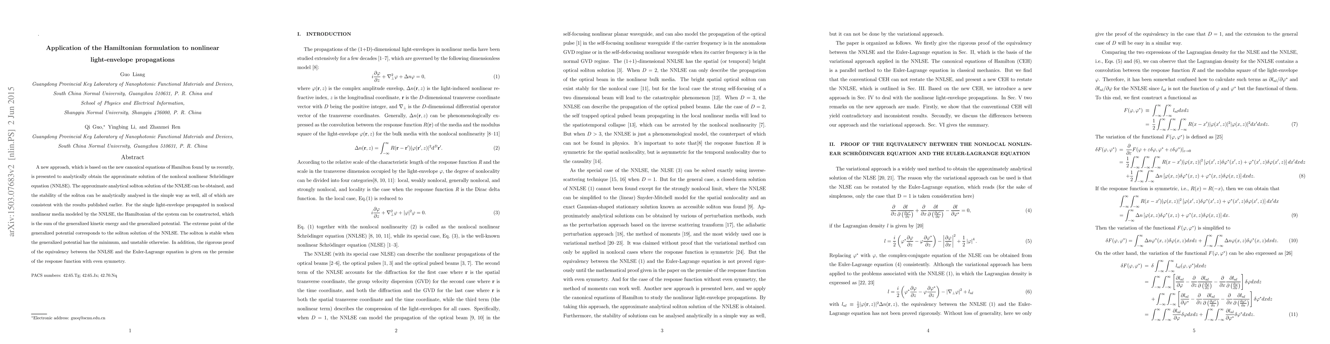 A new approach, which is based on the new canonical equations of Hamilton found by us recently, is presented to analytically obtain the approximate solution of the nonlocal nonlinear Schr\"{o}dinger equation (NNLSE). The approximate analytical soliton solution of the NNLSE can be obtained, and the stability of the soliton can be analytically analysed in the simple way as well, all of which are consistent with the results published earlier. For the single light-envelope propagated in nonlocal nonlinear media modeled by the NNLSE, the Hamiltonian of the system can be constructed, which is the sum of the generalized kinetic energy and the generalized potential. The extreme point of the generalized potential corresponds to the soliton solution of the NNLSE. The soliton is stable when the generalized potential has the minimum, and unstable otherwise. In addition, the rigorous proof of the equivalency between the NNLSE and the Euler-Lagrange equation is given on the premise of the response function with even symmetry.
