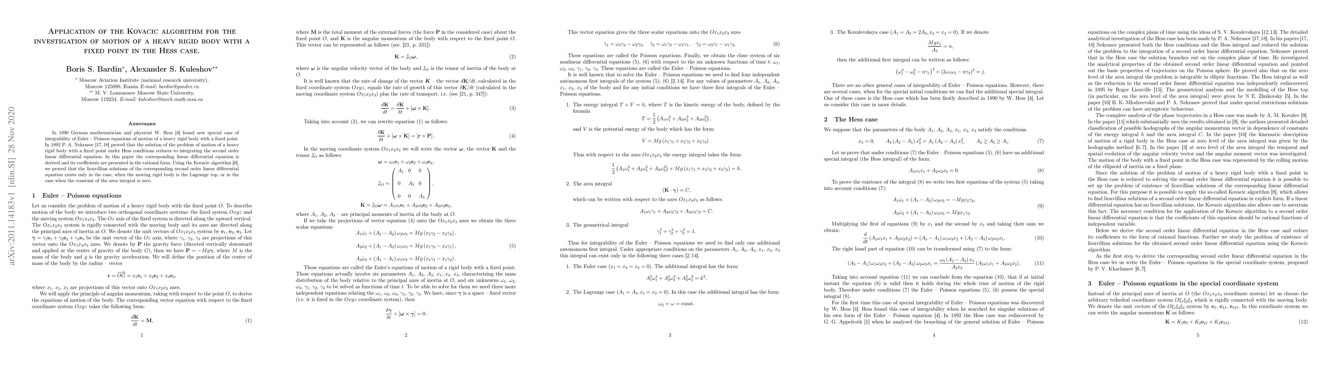 This paper rederives P. A. Nekrasov's 1892 result on the motion of a heavy rigid body with a fixed point under Hess conditions, reducing it to a second-order linear differential equation. Utilizing the Kovacic algorithm, the study proves that liouvillian solutions exist solely for the Lagrange top or when the area integral constant is zero.
