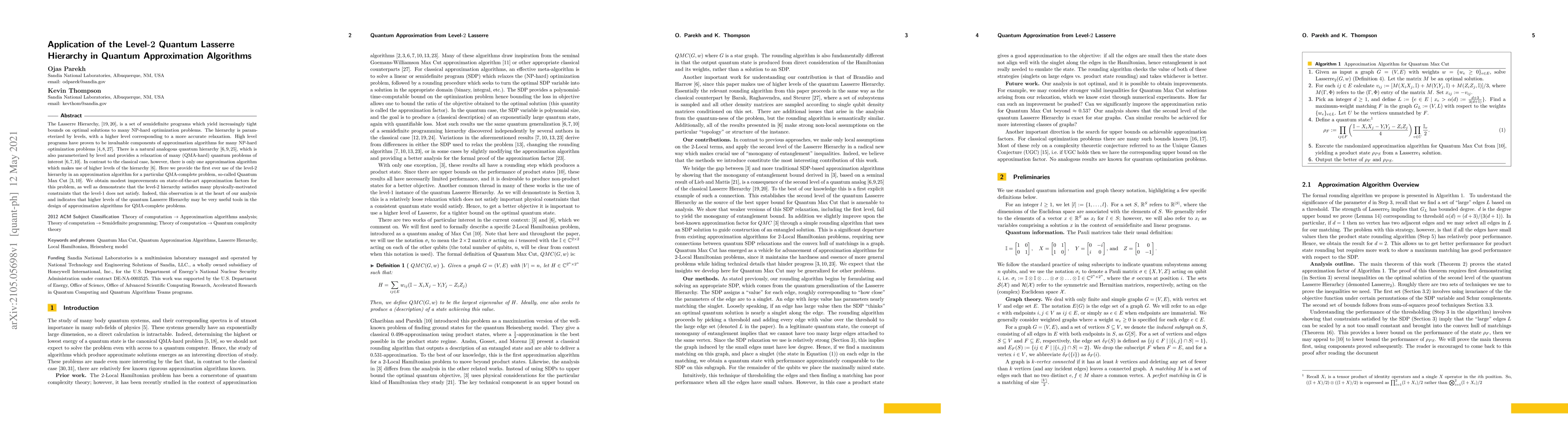 The Lasserre Hierarchy is a set of semidefinite programs which yield increasingly tight bounds on optimal solutions to many NP-hard optimization problems. The hierarchy is parameterized by levels, with a higher level corresponding to a more accurate relaxation. High level programs have proven to be invaluable components of approximation algorithms for many NP-hard optimization problems. There is a natural analogous quantum hierarchy, which is also parameterized by level and provides a relaxation of many (QMA-hard) quantum problems of interest. In contrast to the classical case, however, there is only one approximation algorithm which makes use of higher levels of the hierarchy. Here we provide the first ever use of the level-$2$ hierarchy in an approximation algorithm for a particular QMA-complete problem, so-called Quantum Max Cut. We obtain modest improvements on state-of-the-art approximation factors for this problem, as well as demonstrate that the level-$2$ hierarchy satisfies many physically-motivated constraints that the level-$1$ does not satisfy. Indeed, this observation is at the heart of our analysis and indicates that higher levels of the quantum Lasserre Hierarchy may be very useful tools in the design of approximation algorithms for QMA-complete problems.