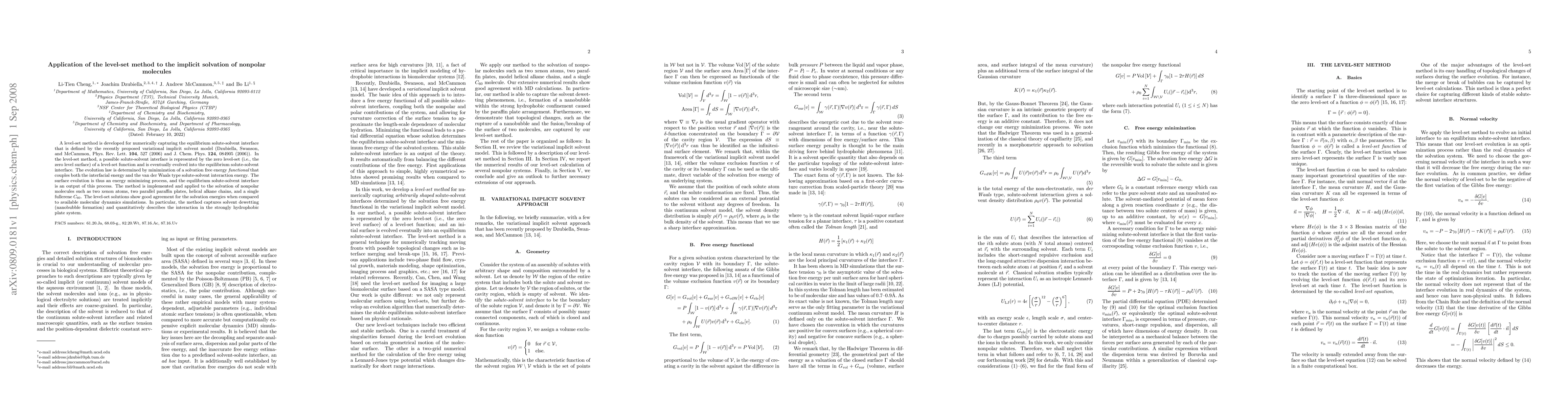 This paper develops a level-set method to capture the equilibrium solute-solvent interface in implicit solvation models, showing good agreement with molecular dynamics simulations for nonpolar molecules like xenon atoms and fullerene $C_{60}$. The method effectively describes solvent dewetting and hydrophobic interactions.